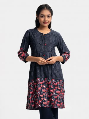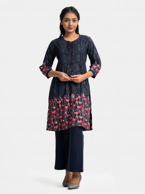 Navy Blue all-over printed Straight-cut Kameez in Georgette fabric. Designed with a V-neck and three-quarter sleeves. Sequined net attachment at the front and cuffs. Detailed with adjustable tasseled waist cords on the left side.