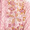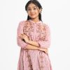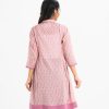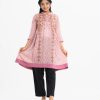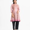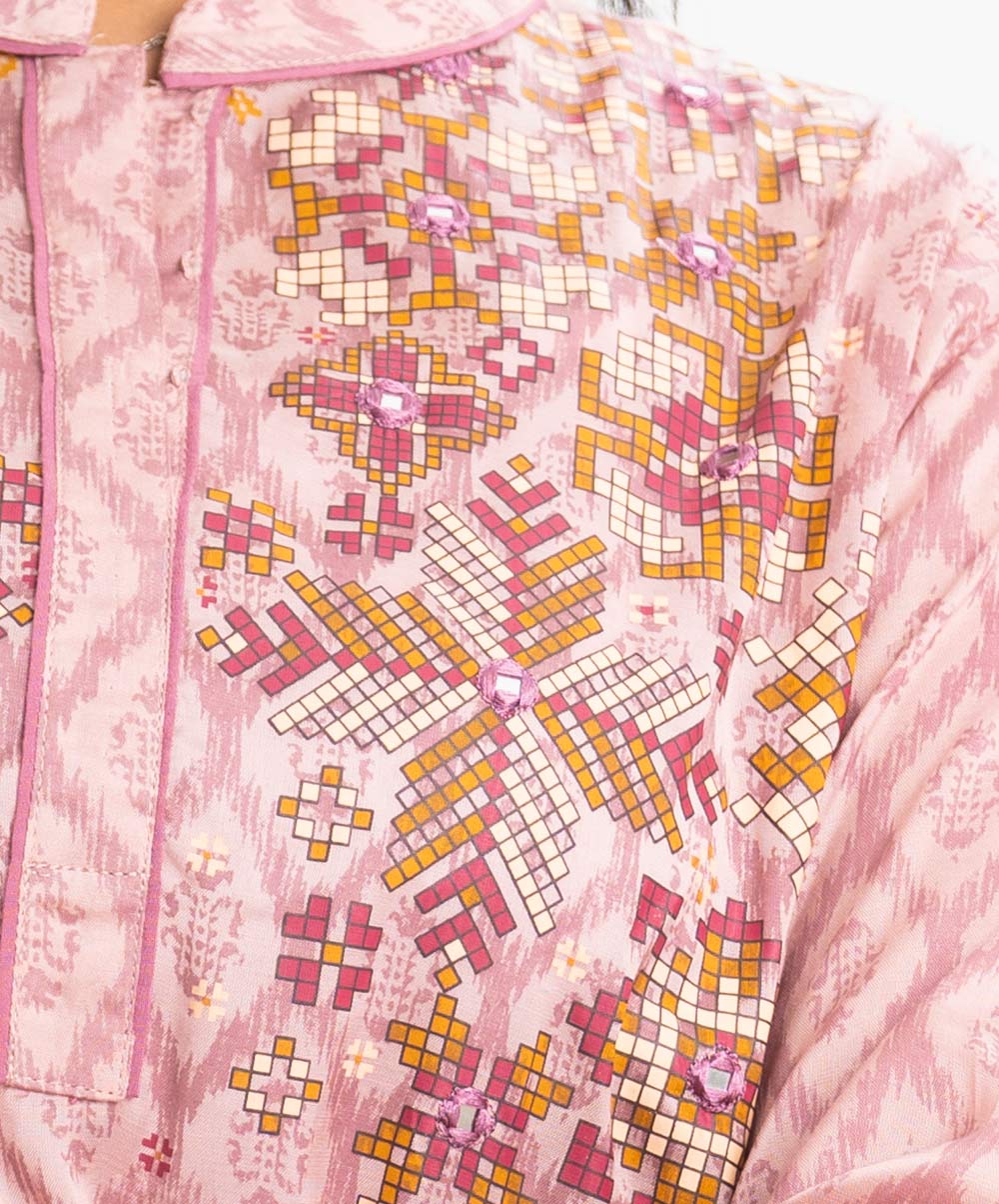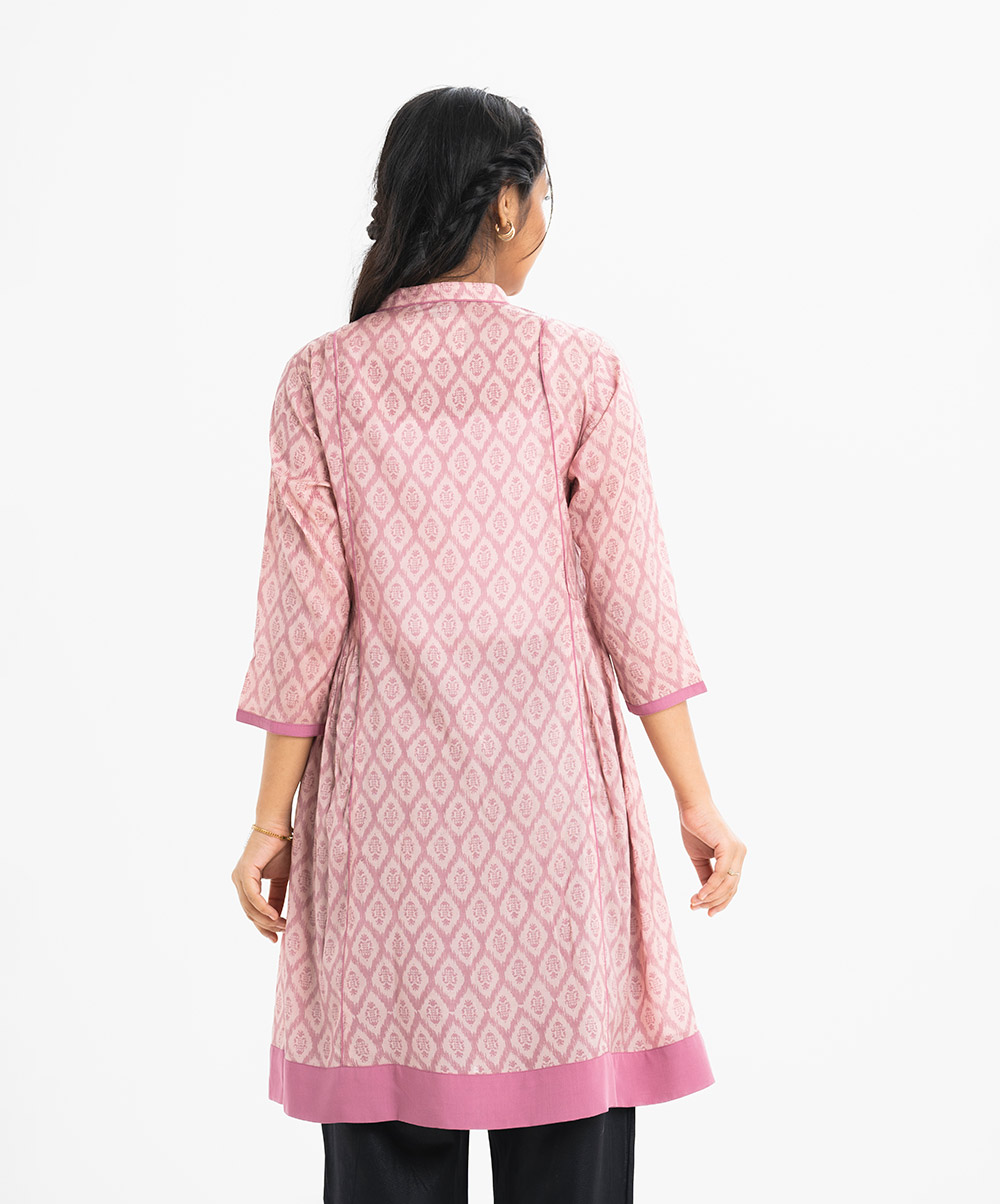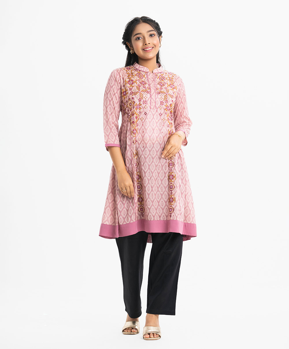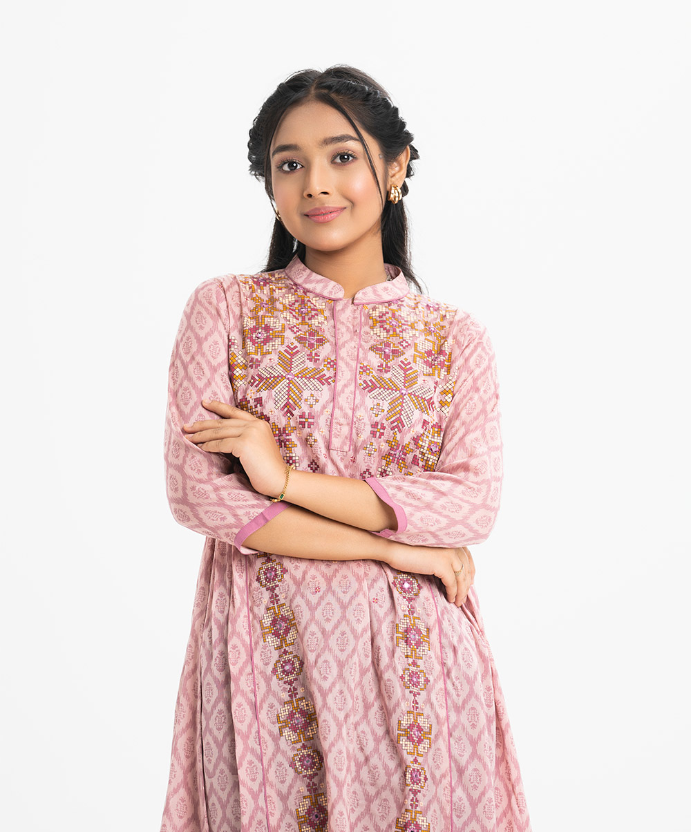 Teen girls printed A-line kameez in cotton fabric. Mandarin collar with placket, three-quarter sleeves. Pleated on both sides waistline and karchupi at front.