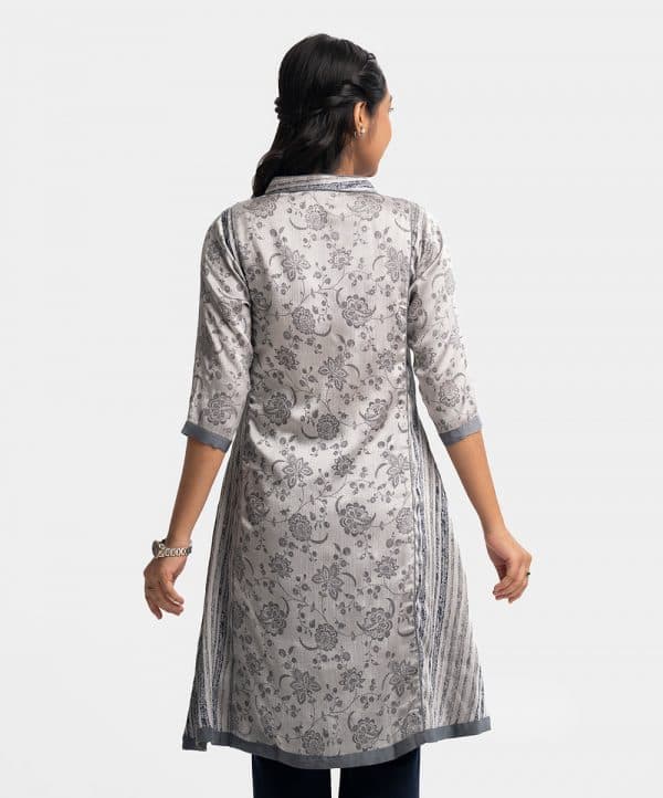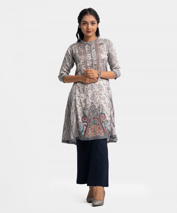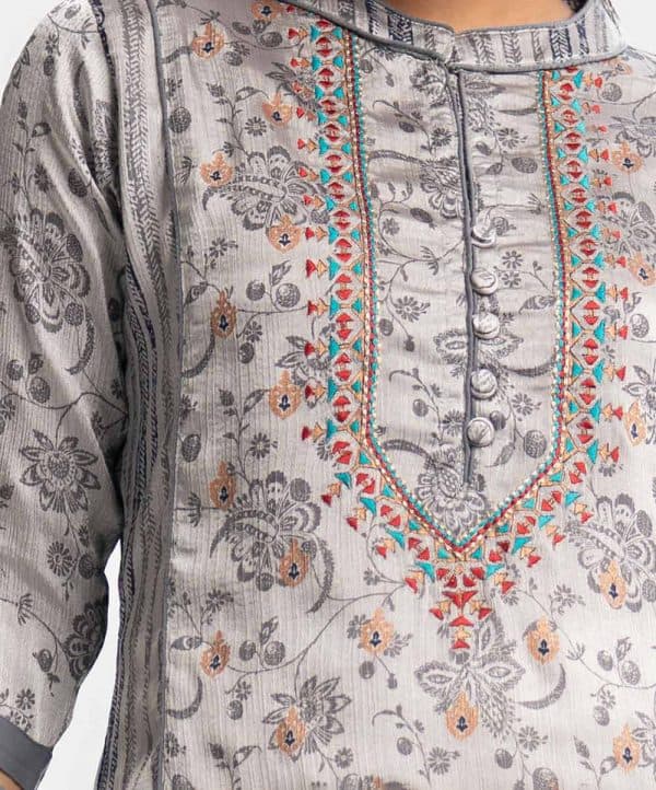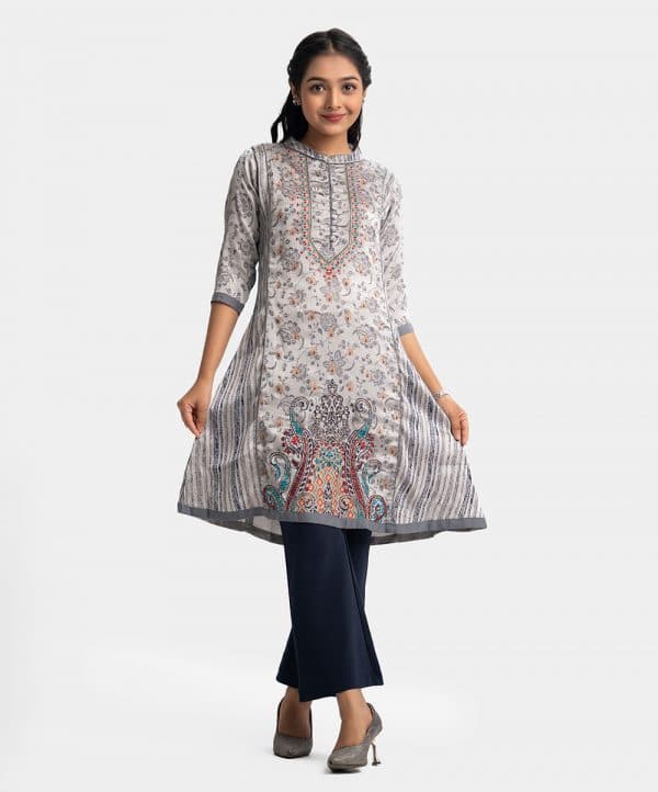 Teen girls printed A-line kameez in textured georgette fabric. Mandarin collar with design buttons placket, three-quarter sleeves. Embroidery at front.