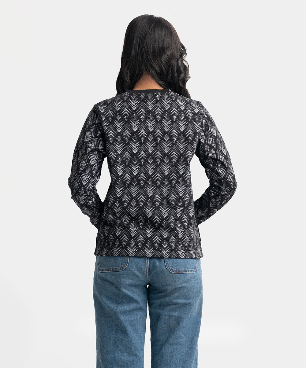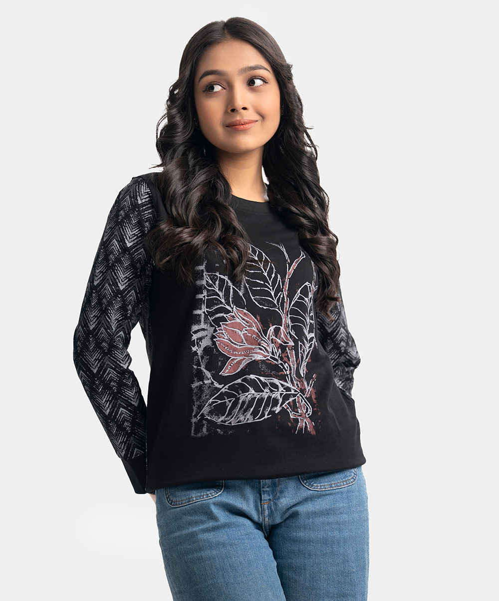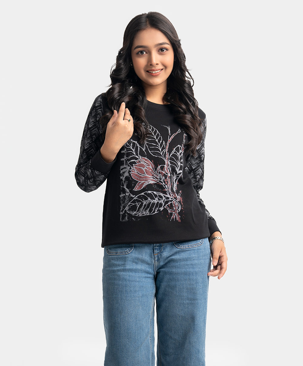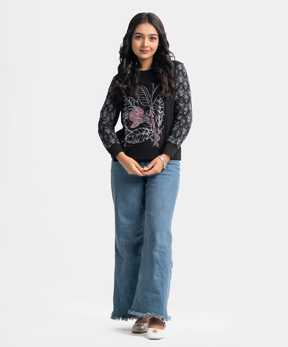 Teen girl’s printed sweatshirt in cotton terry fabric. Round collar, full sleeves and a straight hem. Featuring narrow ribbing at the cuffs and hem.