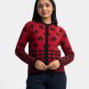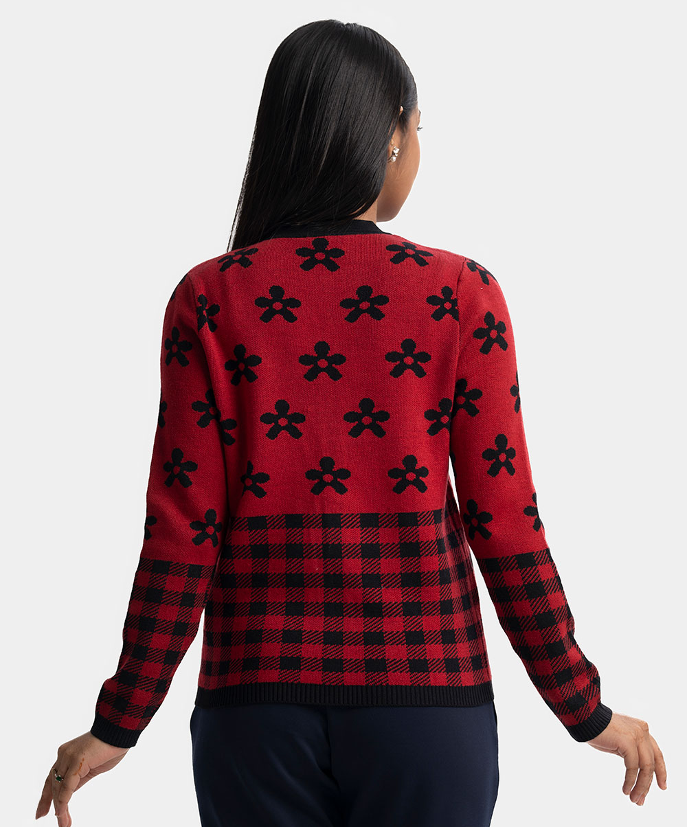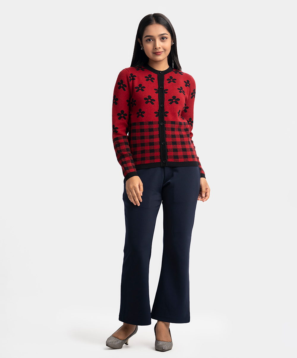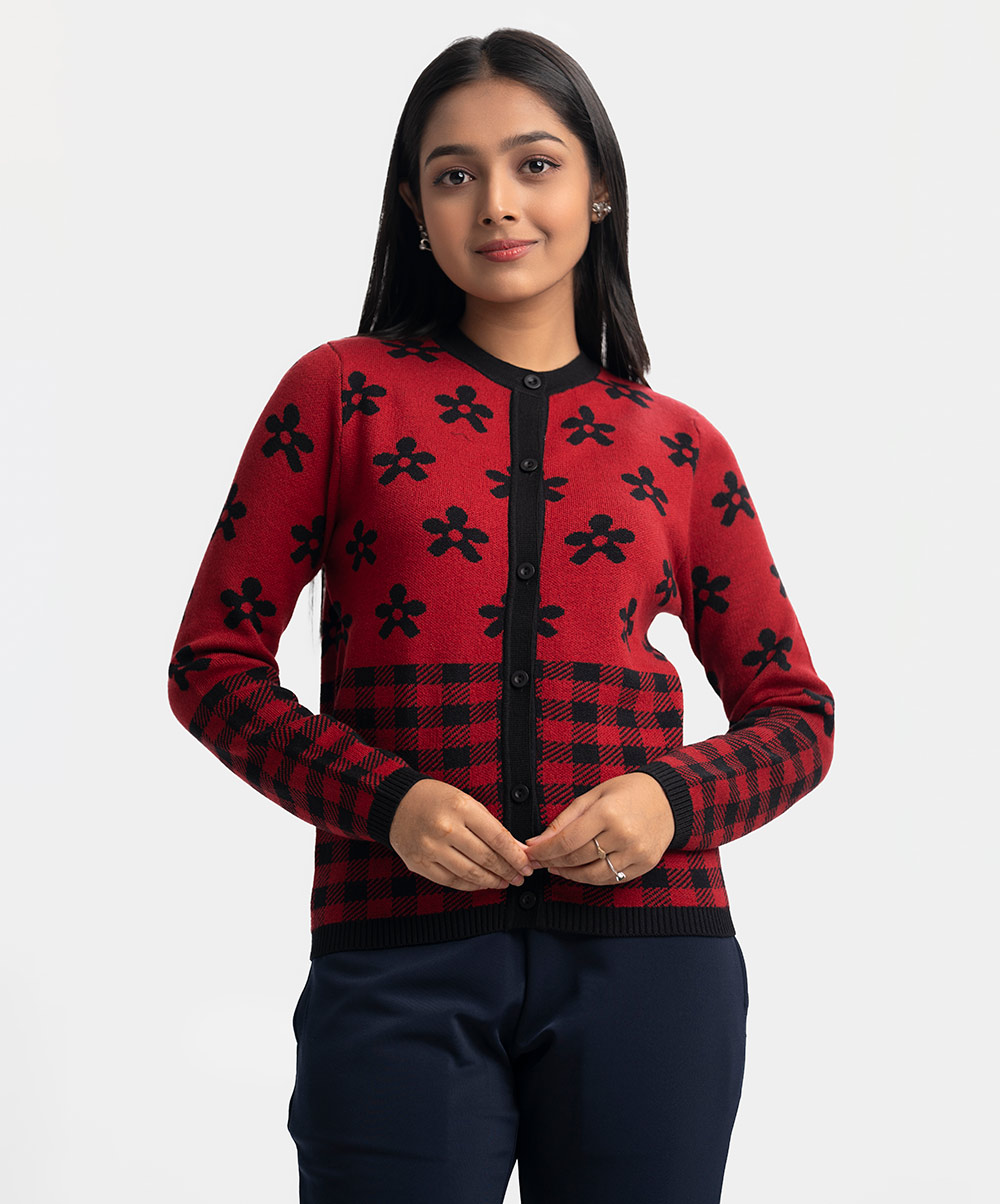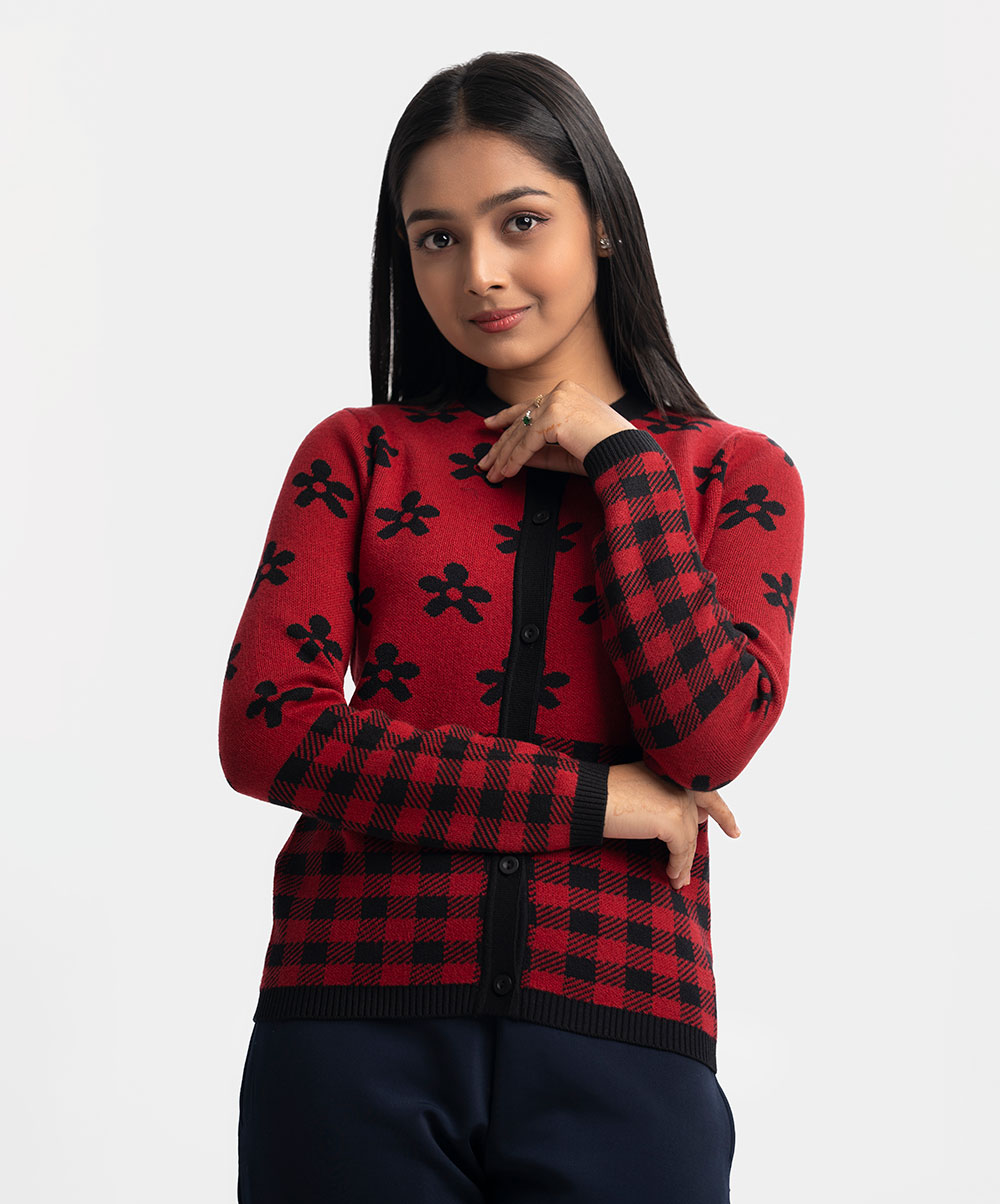Teen girl’s floral pattern woven detail sweater in viscose blended knit fabric. Round neck, full sleeves and front buttons opening.