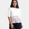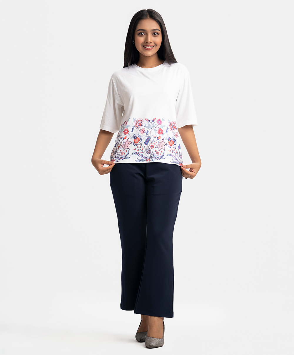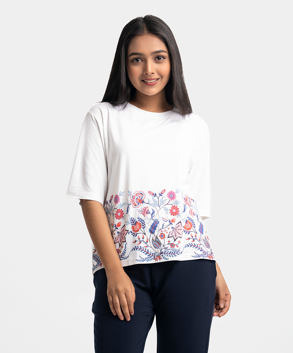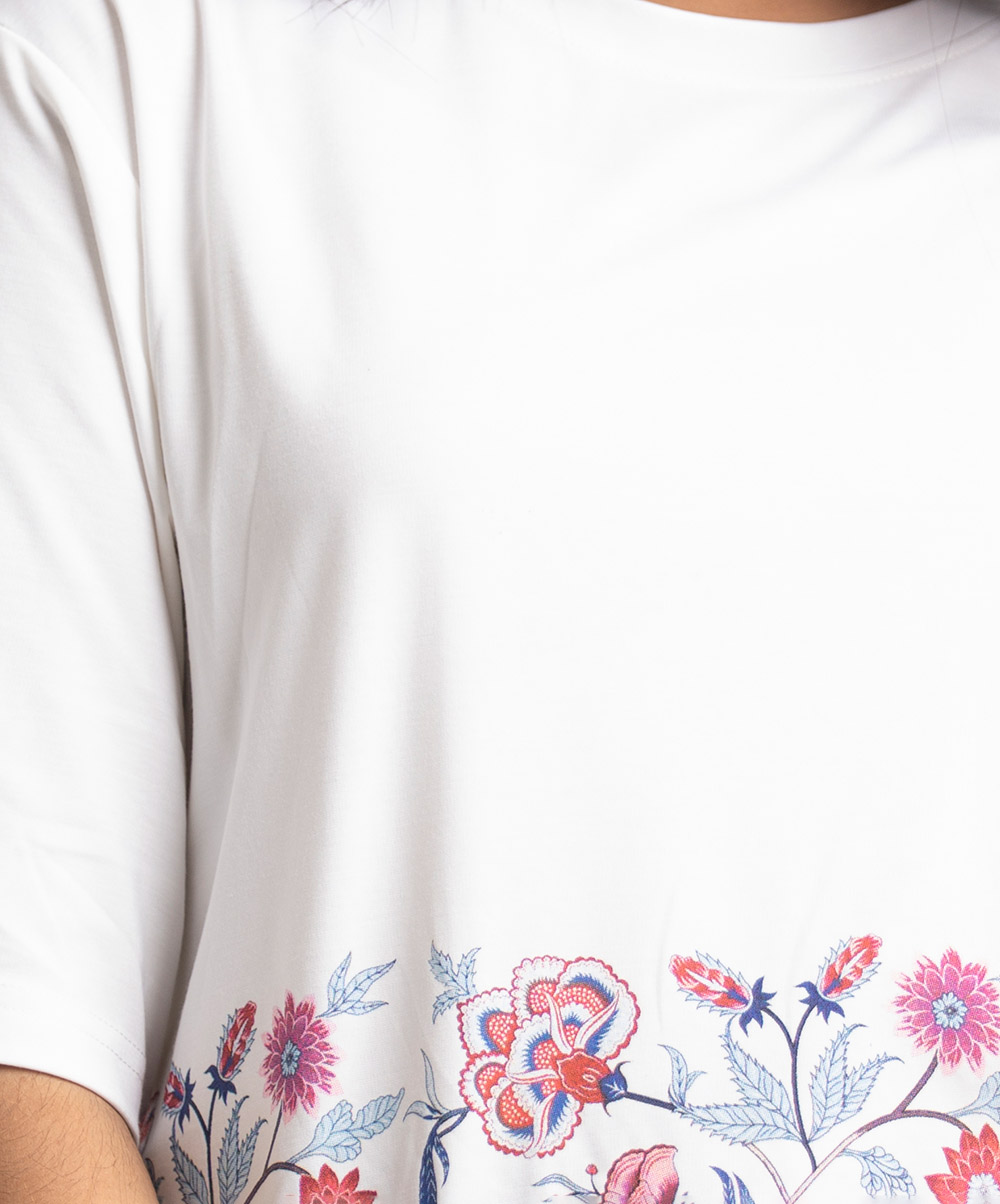 Teen girl’s t-shirt in cotton single jersey fabric. Round neck, short sleeves. Floral print on the hemline.