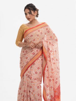 White & Orange Cotton Karchupi Saree