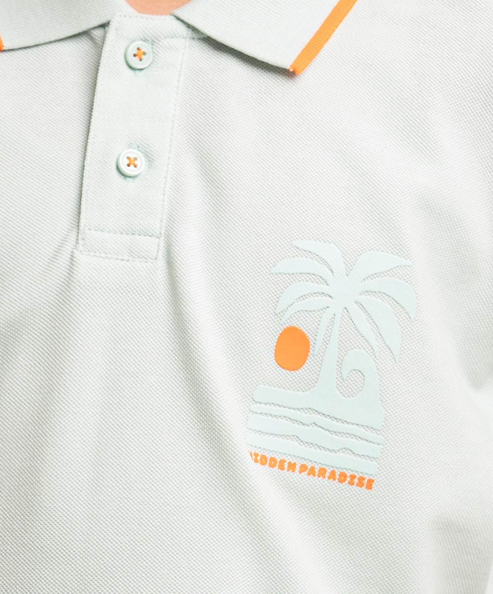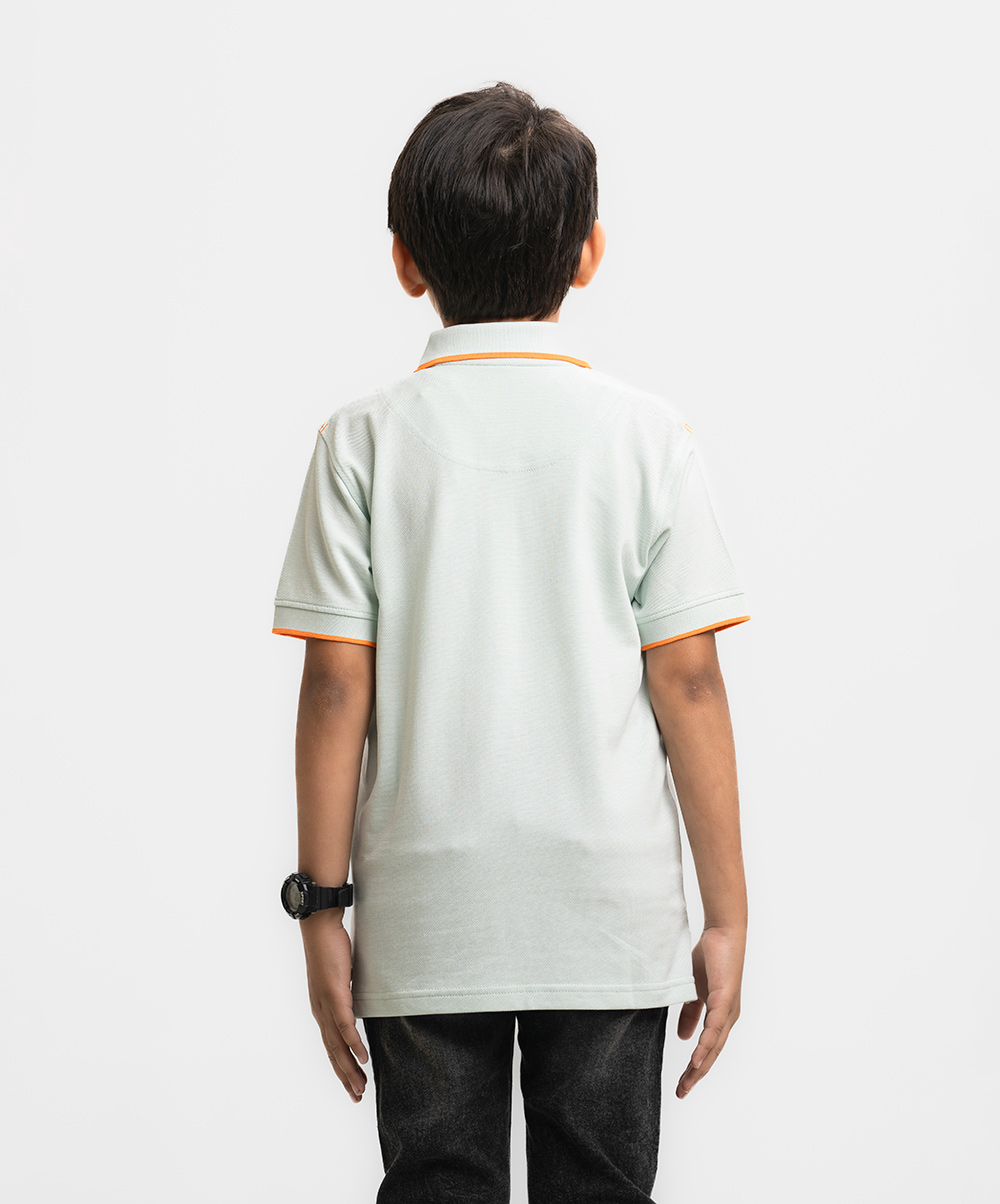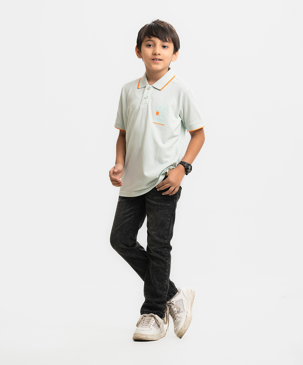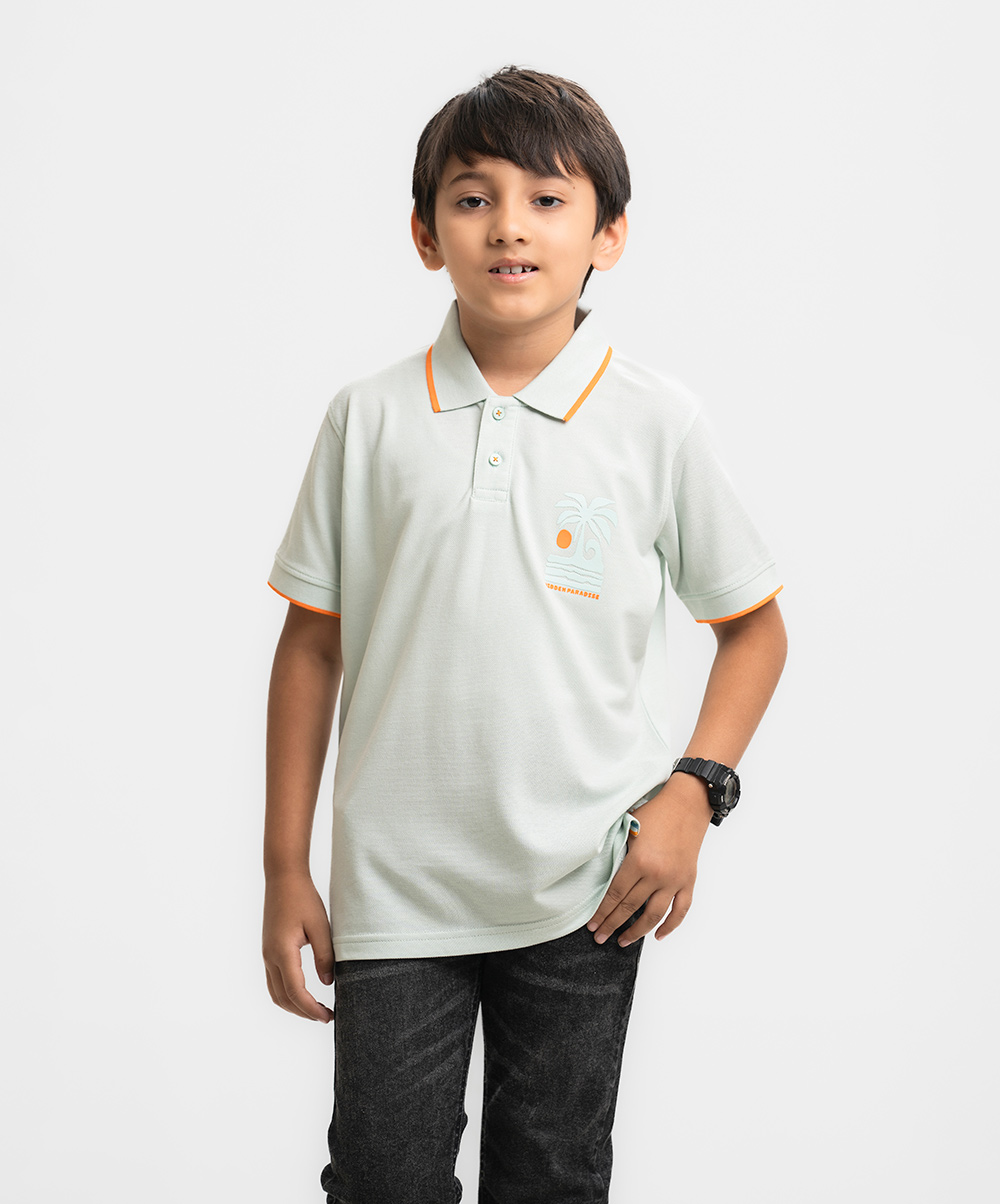 Kid boys Polo in cotton pique fabric. Classic collar, short sleeves and print at the front.