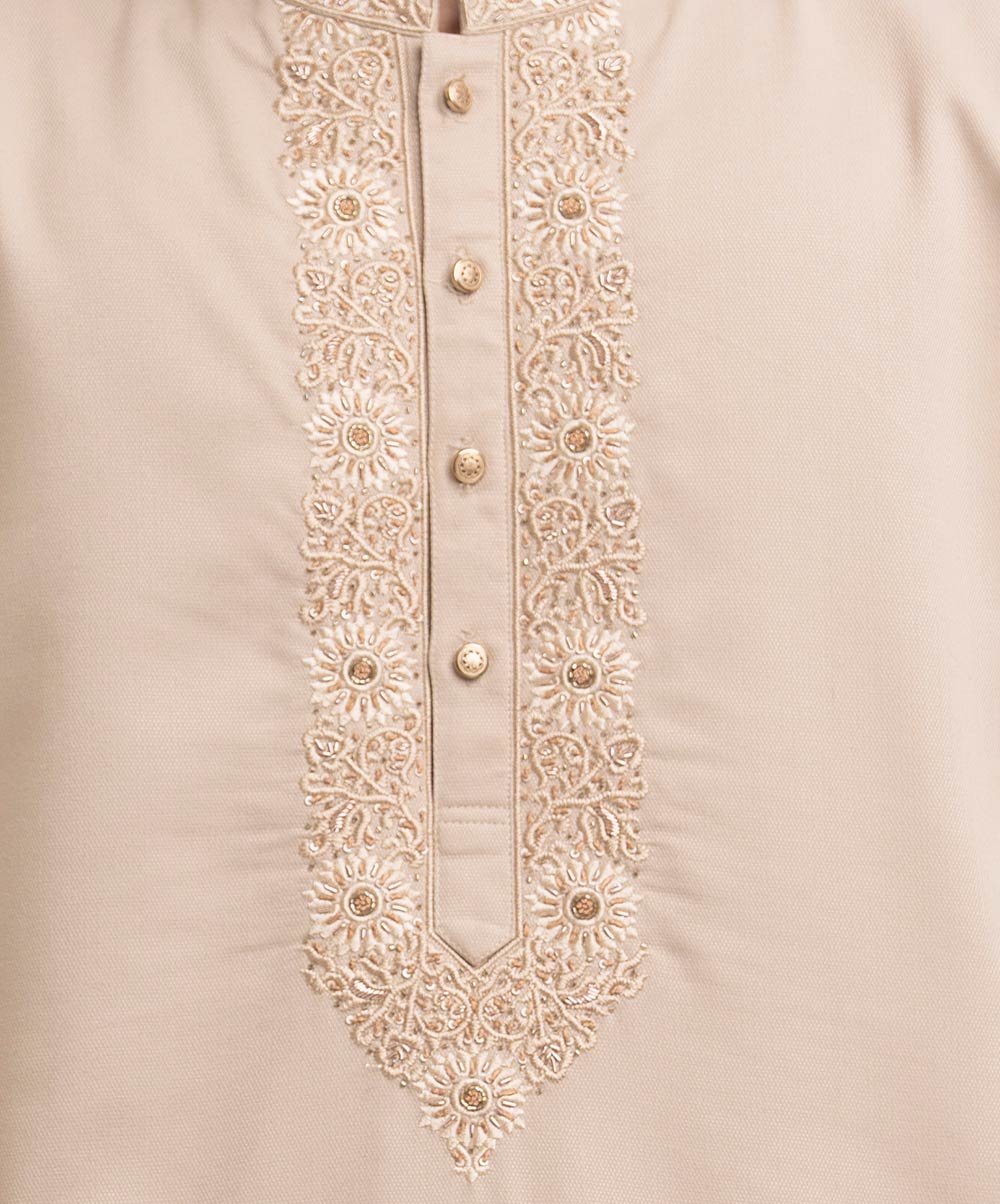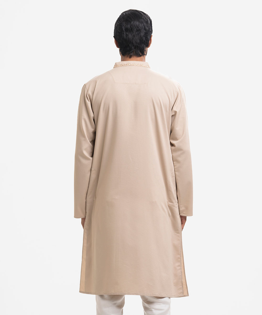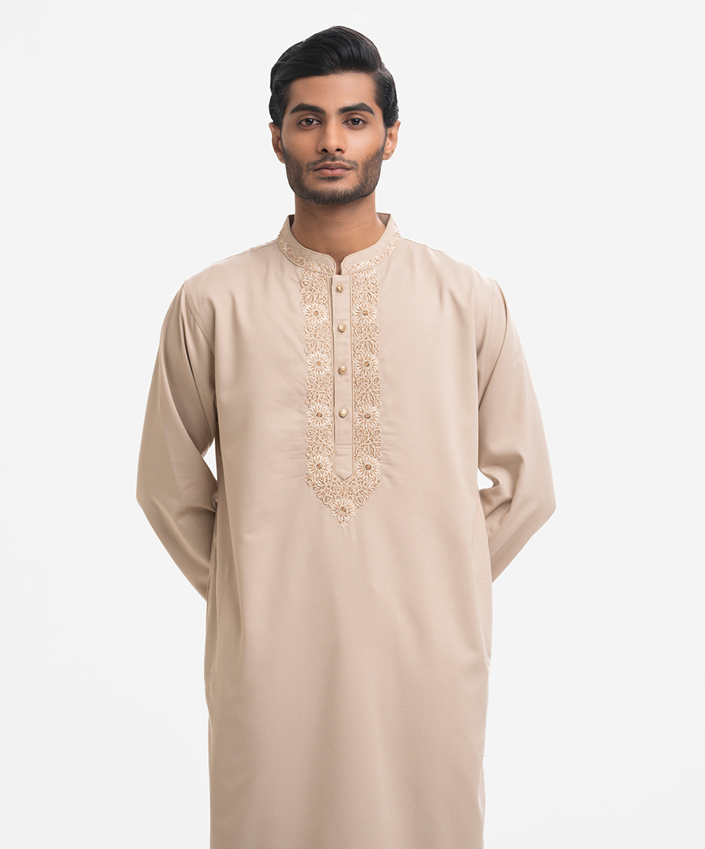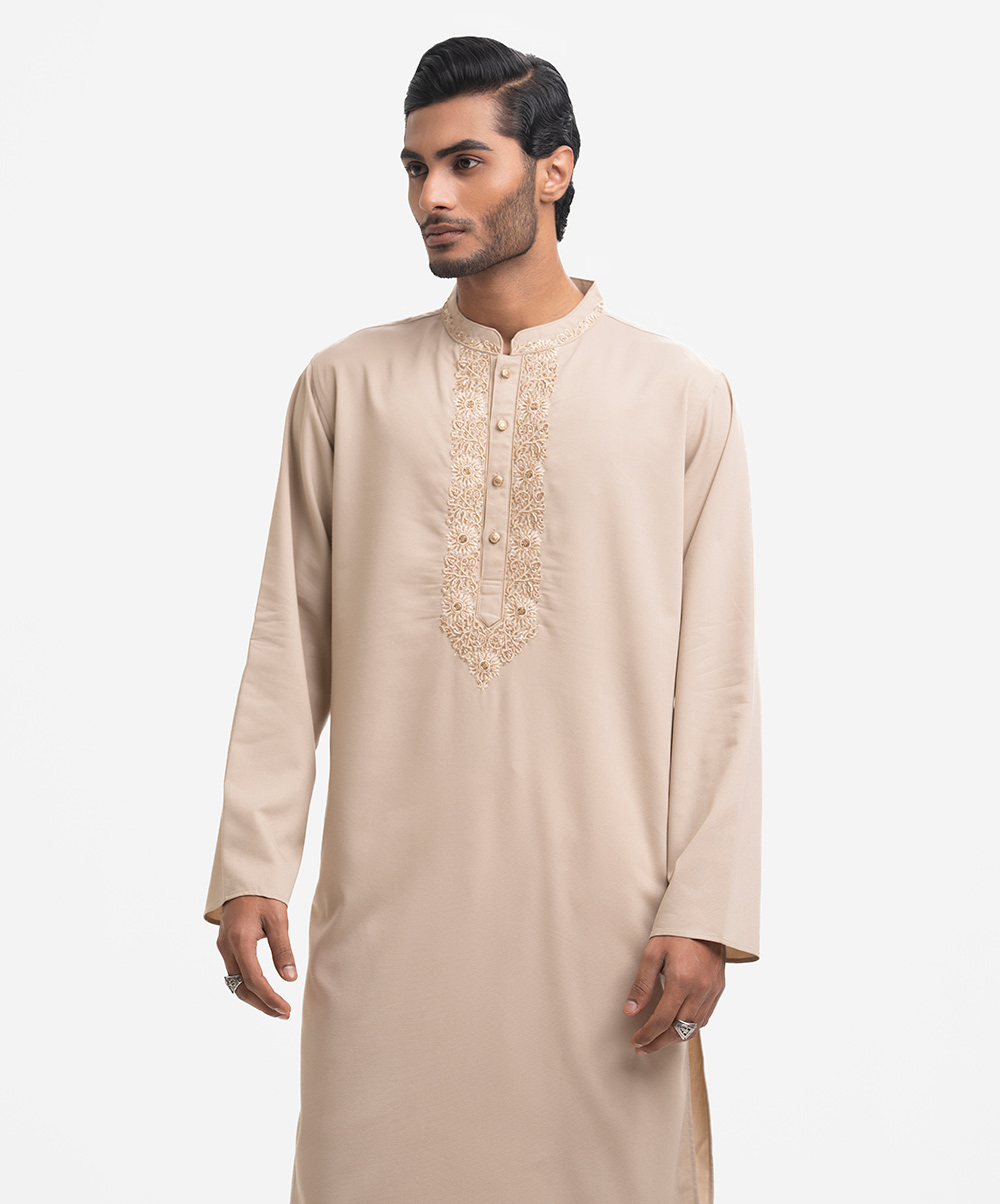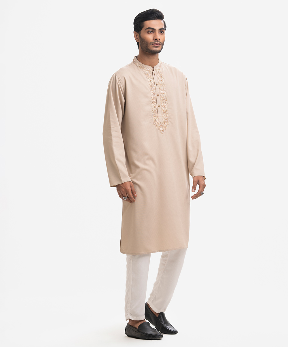 Men’s premium panjabi in jacquard fabric. Long sleeves, inseam side pockets. Karchupi on the collar and placket.