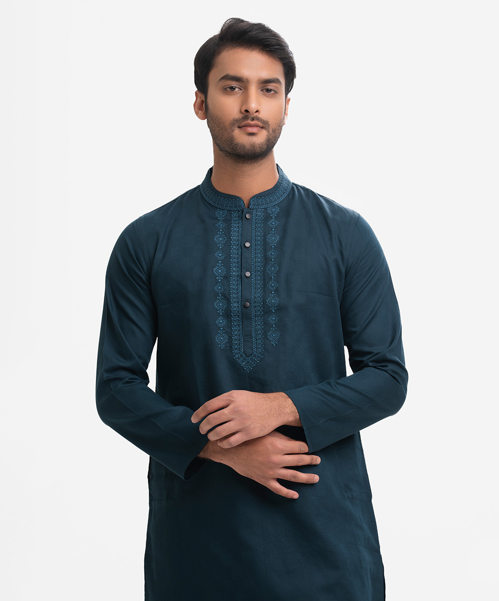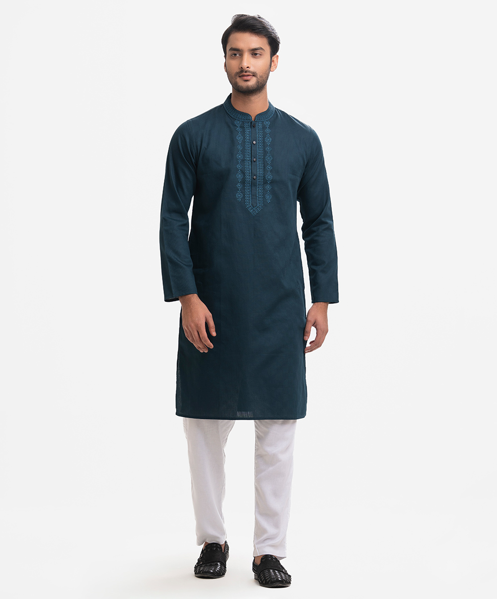 Men’s fitted panjabi in cotton fabric. Long sleeves, inseam side pockets. Handstitched on the collar and placket.
