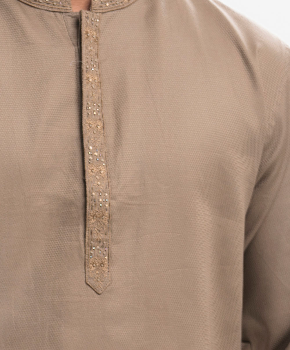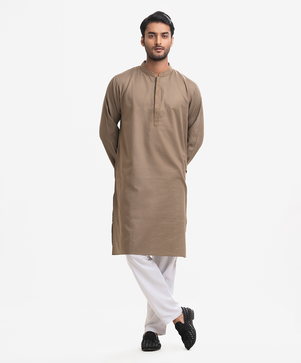 Men’s fitted panjabi in jacquard fabric. Long sleeves, inseam side pockets. Karchupi on the collar and placket.