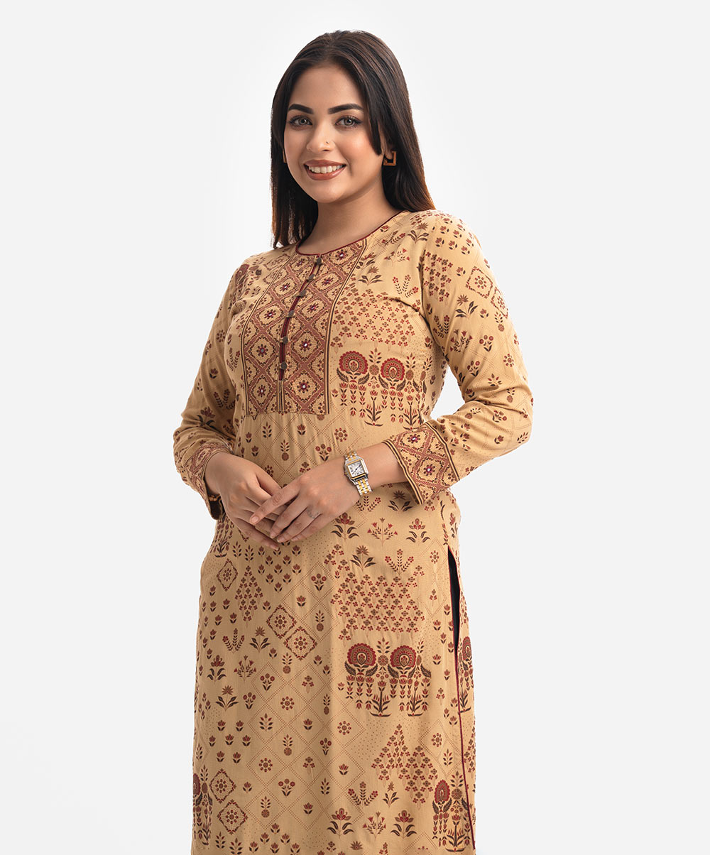 Round neck A-line viscose kameez with long sleeves and karchupi details.