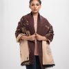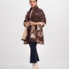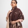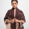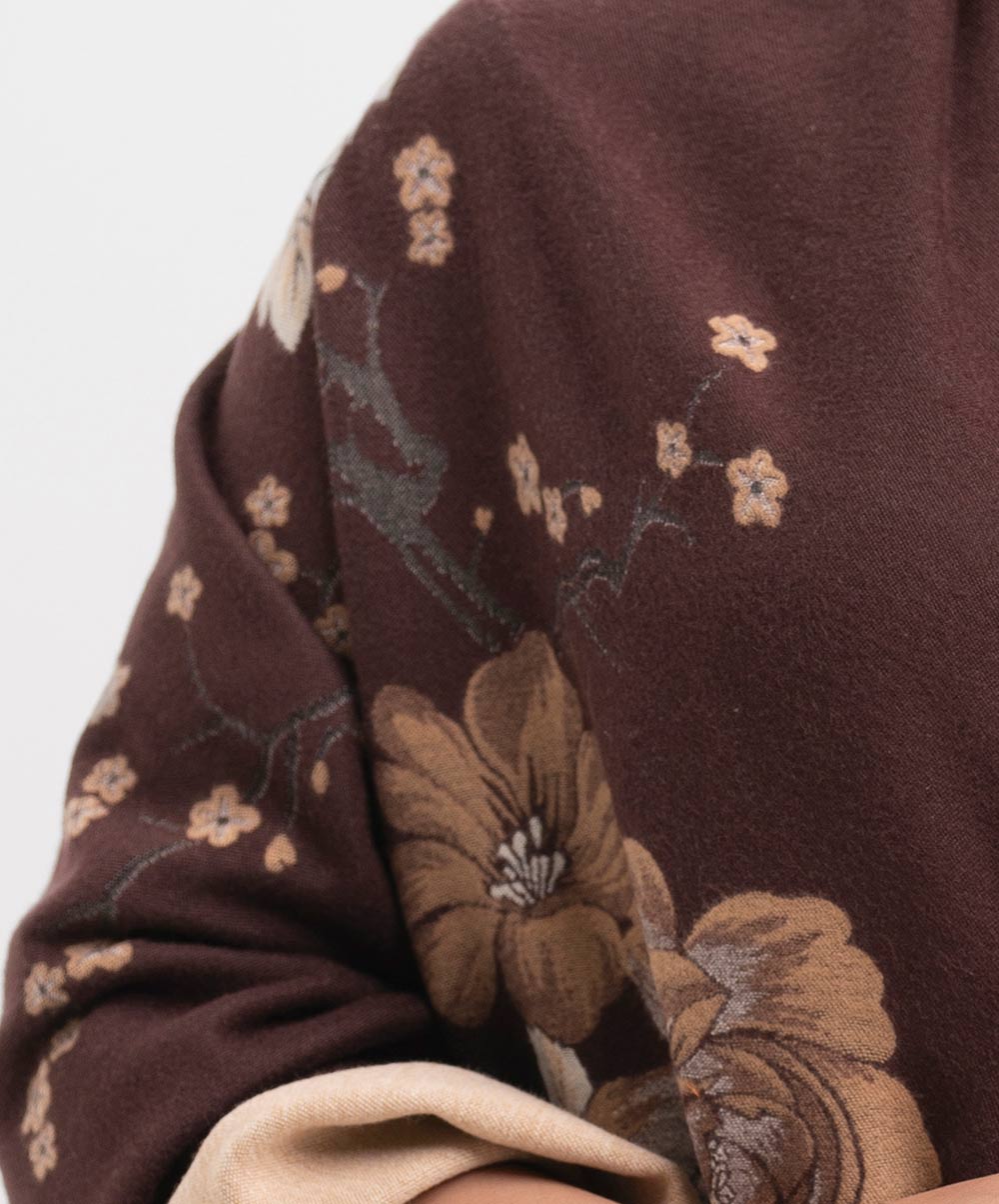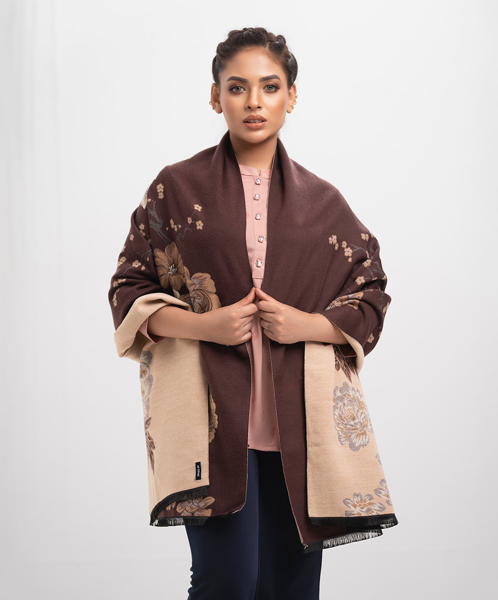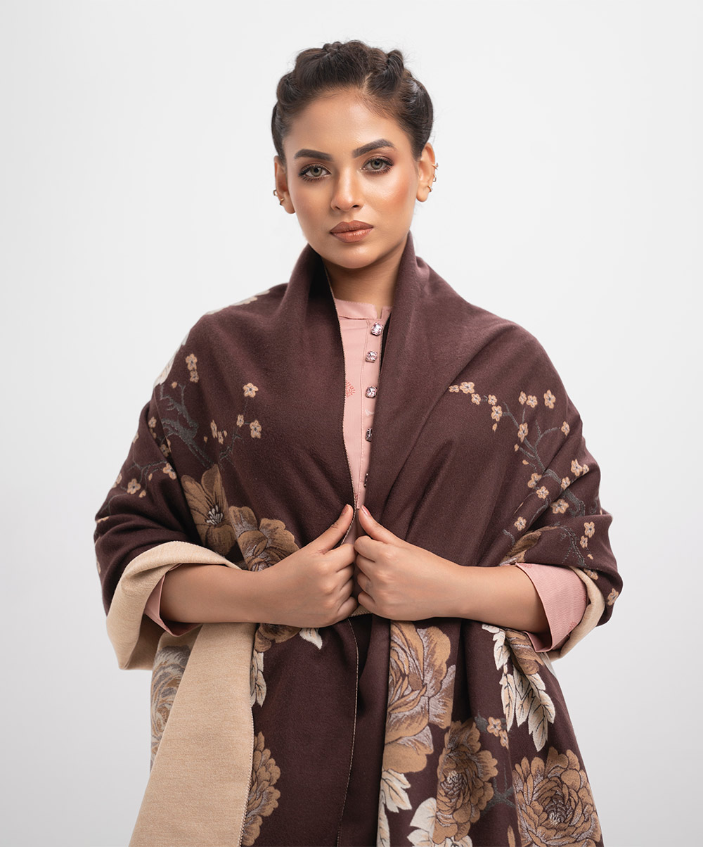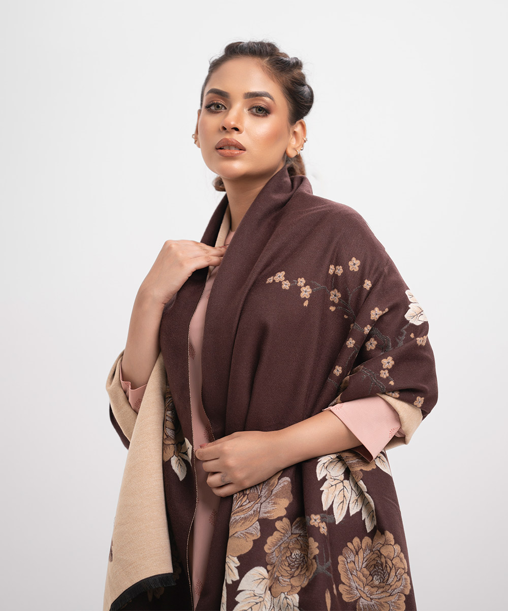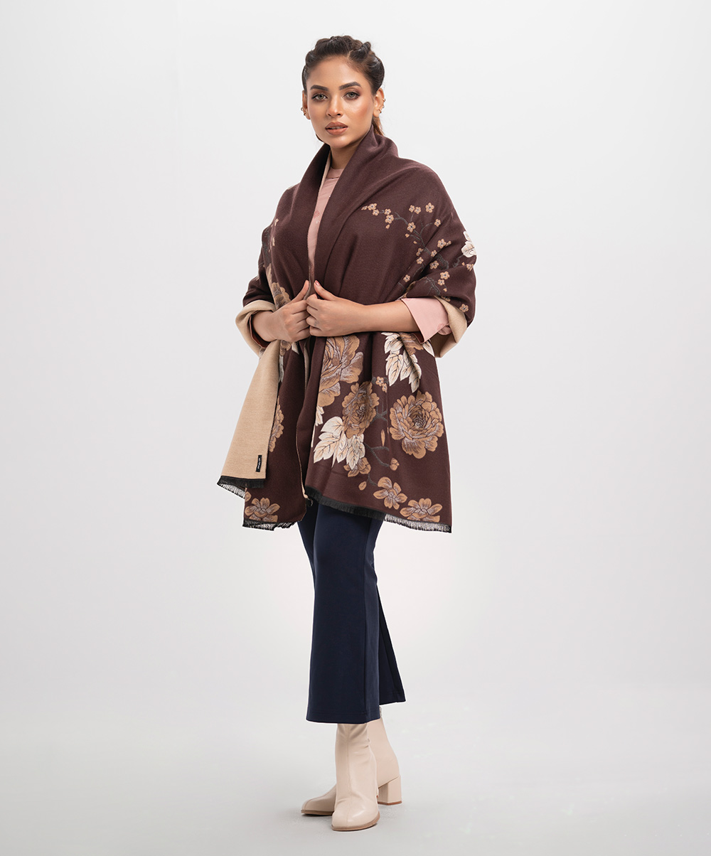 Women’s shawl in woolen fabric. All over woven floral pattern.