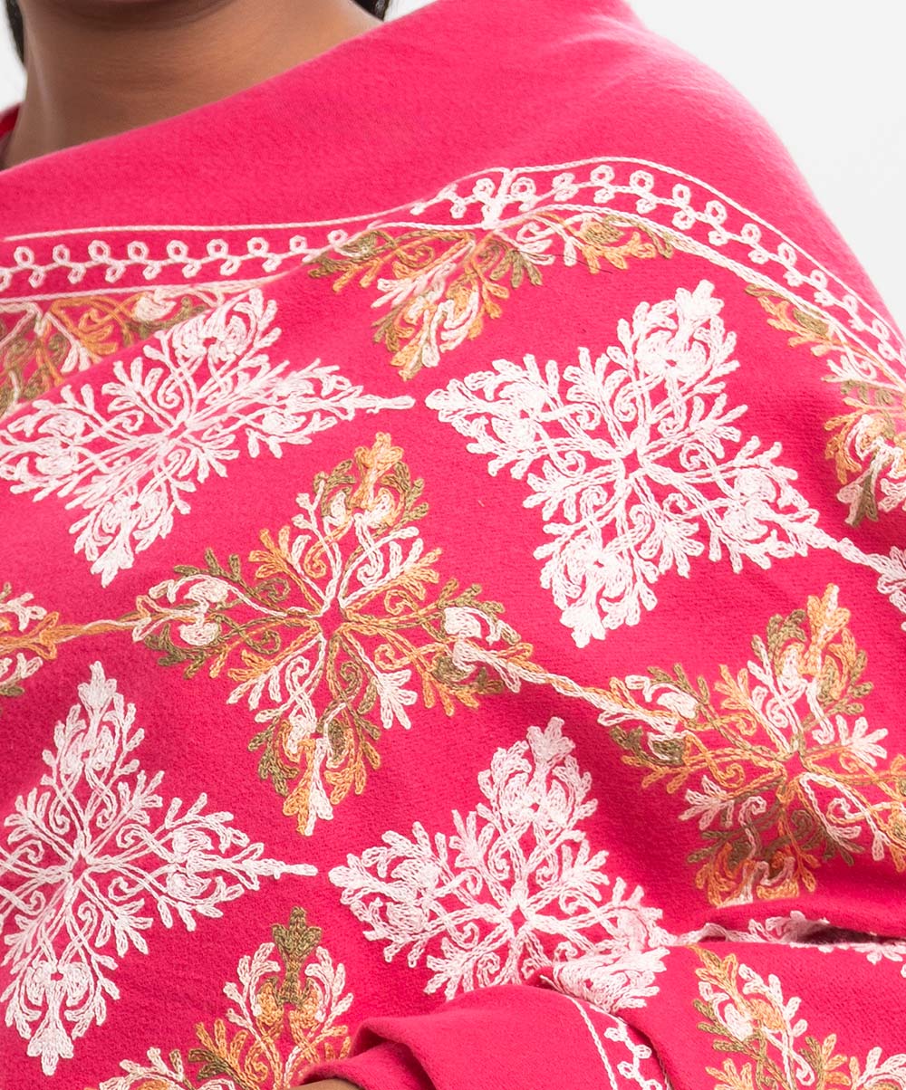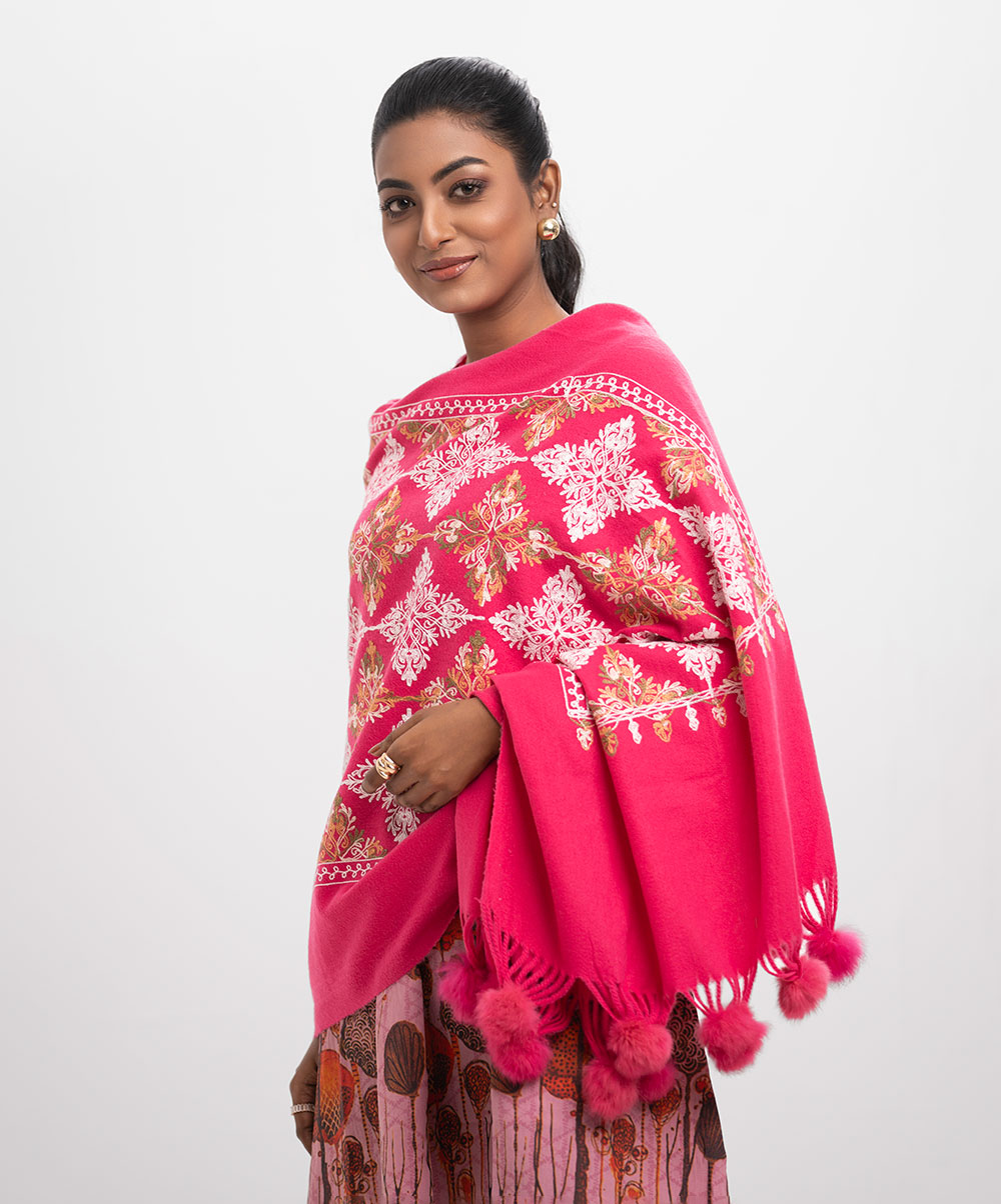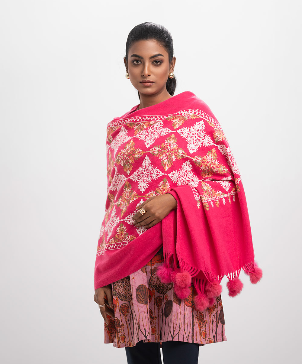 Deep Pink Woolen Embroidered Shawl
