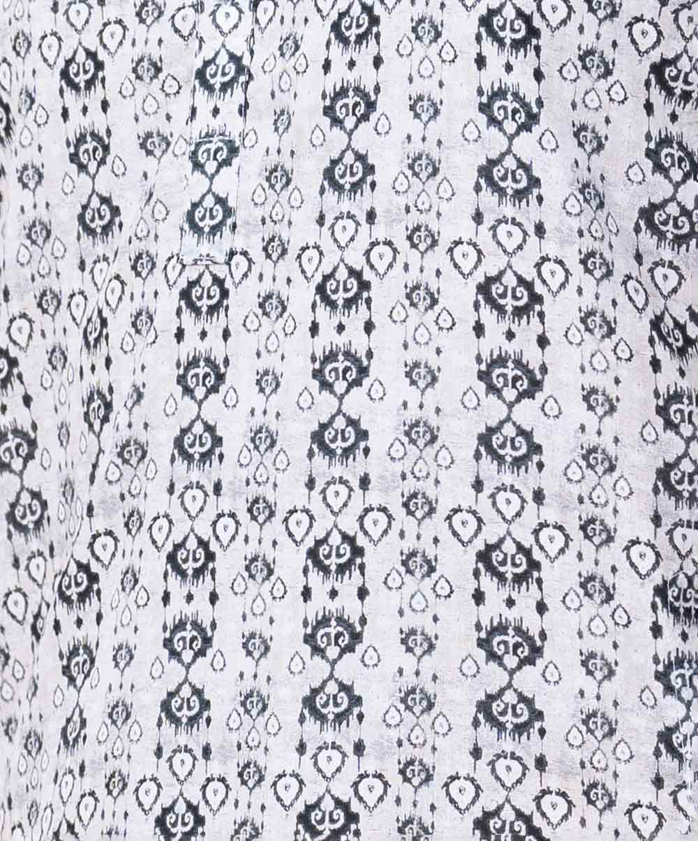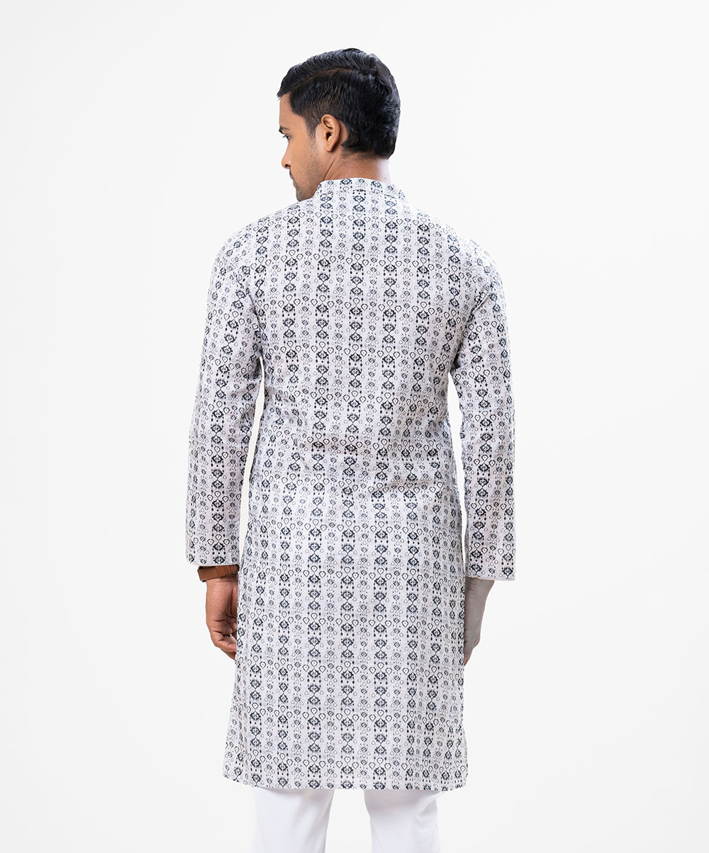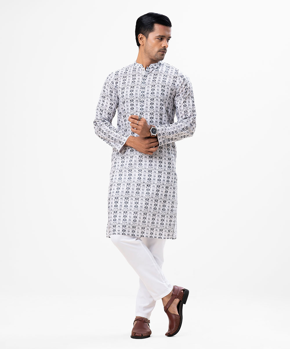 Men’s semi fitted panjabi in printed cotton fabric. Mandarin collar and inseam pockets.