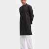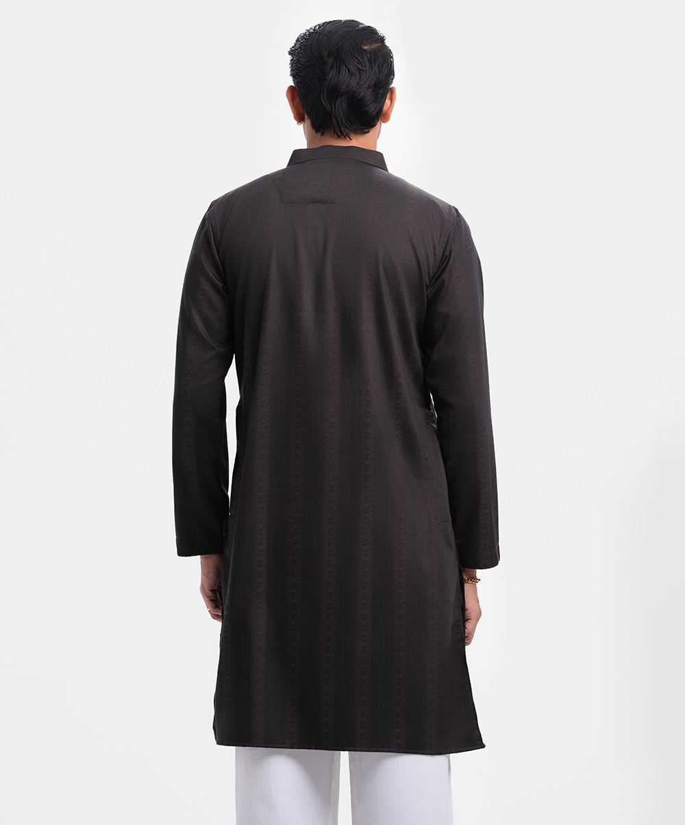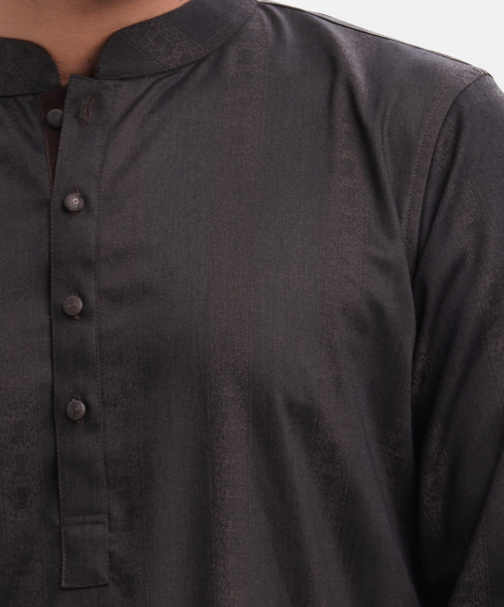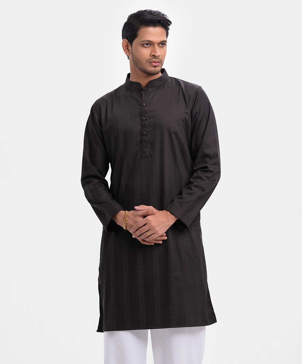 Men’s semi fitted panjabi in jacquard fabric. Mandarin collar with metal buttons on the placket & full sleeves.