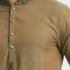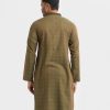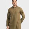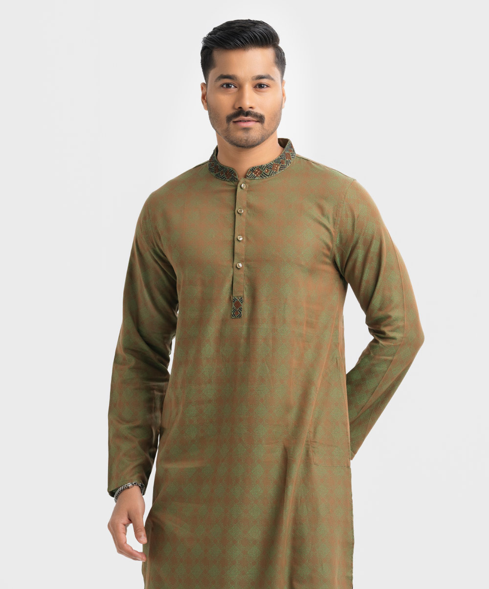 Men’s semi fitted panjabi in jacquard fabric. Karchupi at mandarin collar with metal buttons on the placket & full sleeves.