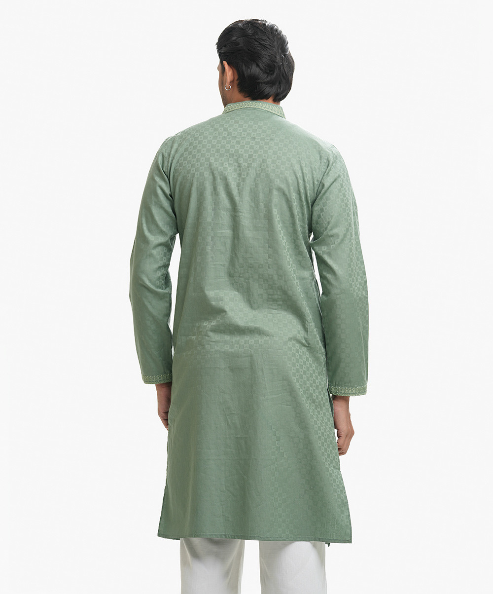 Men’s semi fitted panjabi in cotton jacquard fabric. Embroidery at the mandarin collar & placket. Inseam side pockets.