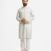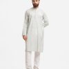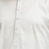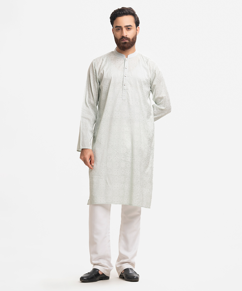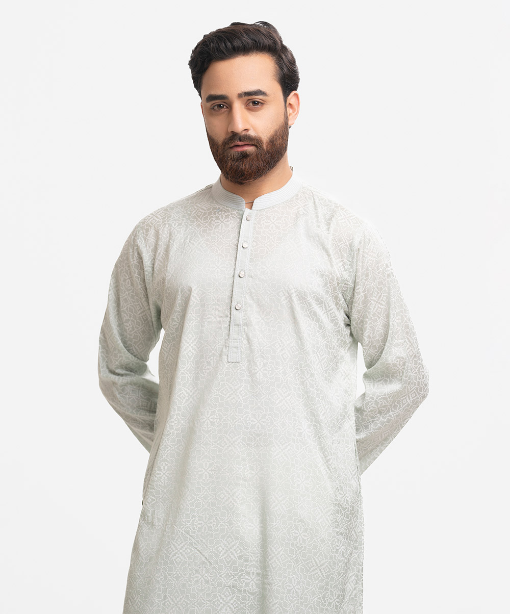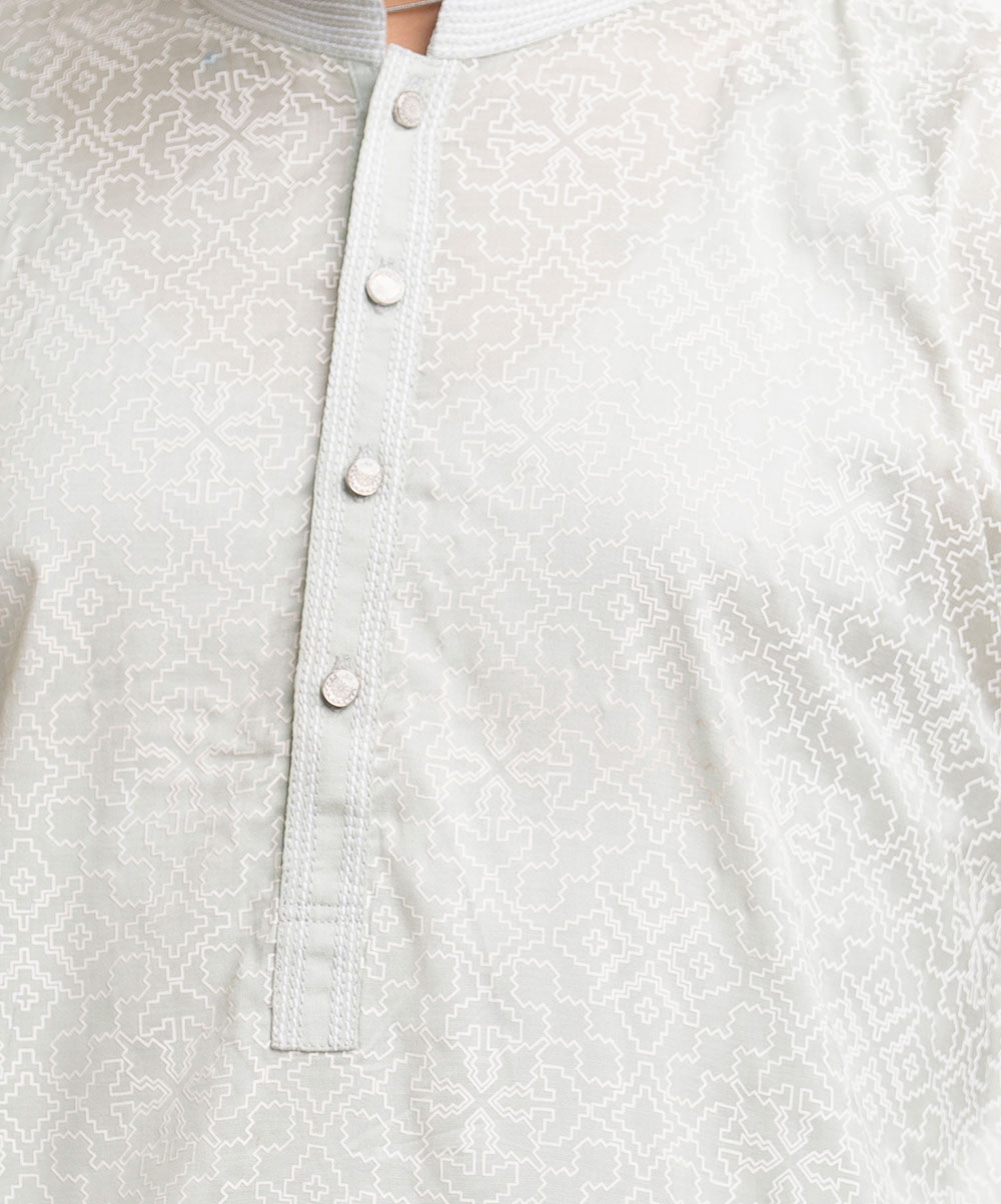 Men’s printed semi fitted panjabi in cotton fabric. Line stitching at mandarin collar and metal buttons placket. Inseam side pockets.