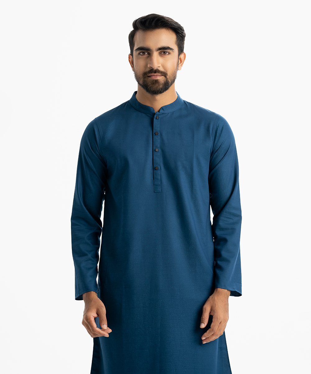 Men’s semi-fitted panjabi in Jacquard fabric. Mandarin collar and inseam pockets.
