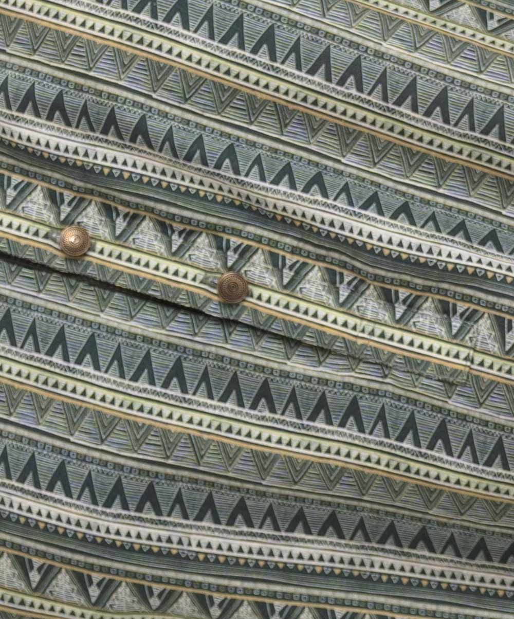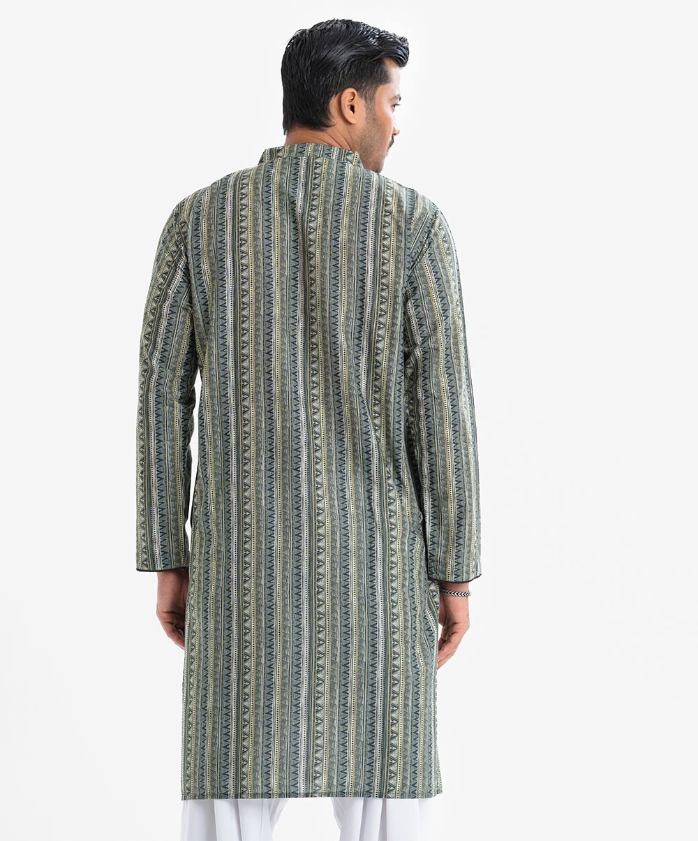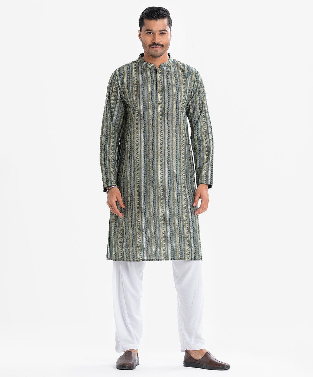 Men’s aztec printed semi fitted panjabi in cotton fabric. Mandarin collar with metal buttons placket and inseam pockets.
