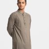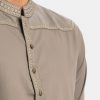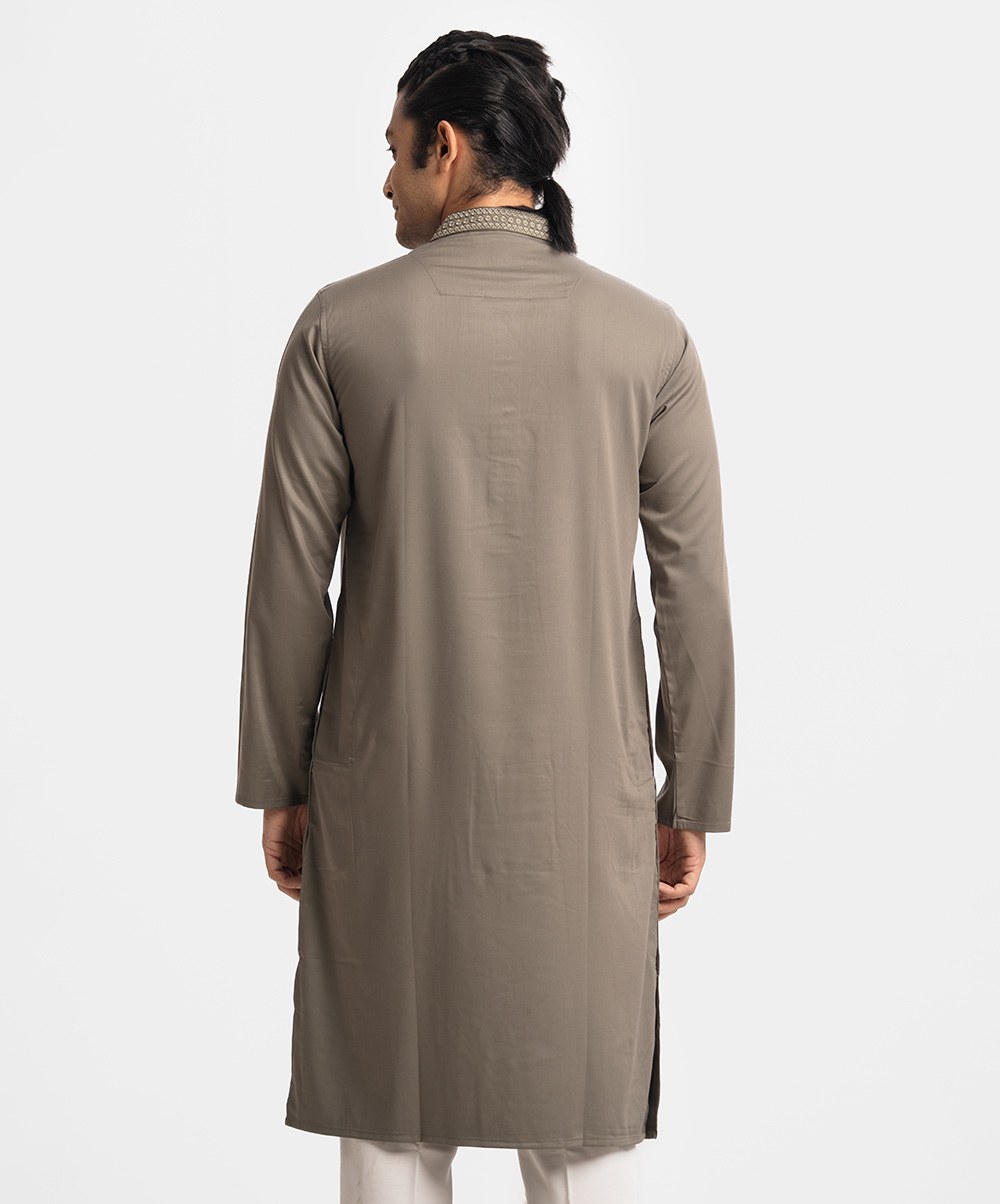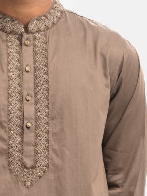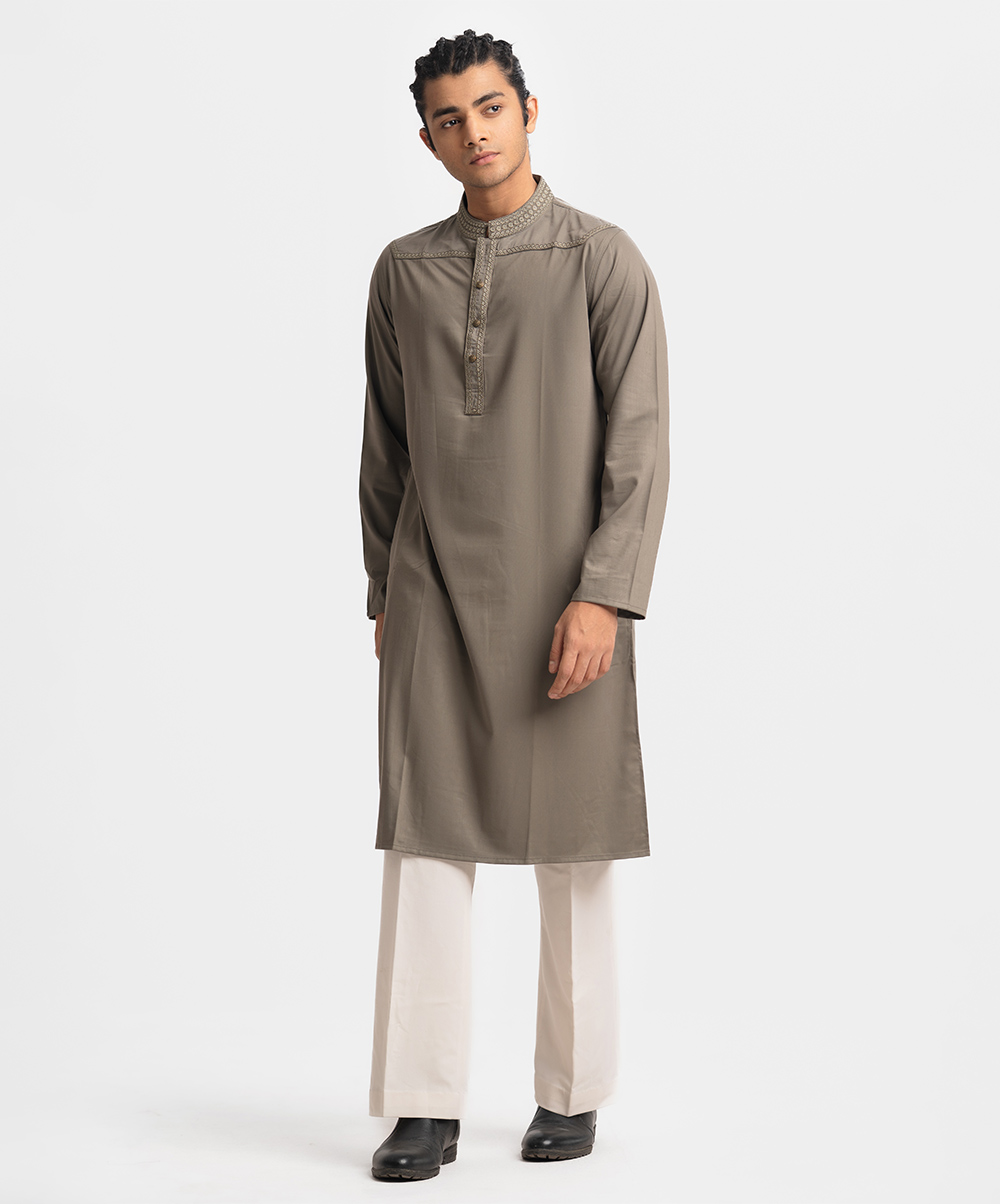 Men’s semi-fitted panjabi in cotton fabric. Embroidery at front. Mandarin collar & metal buttons placket. Full sleeves and inseam pockets.