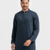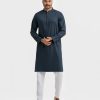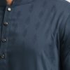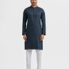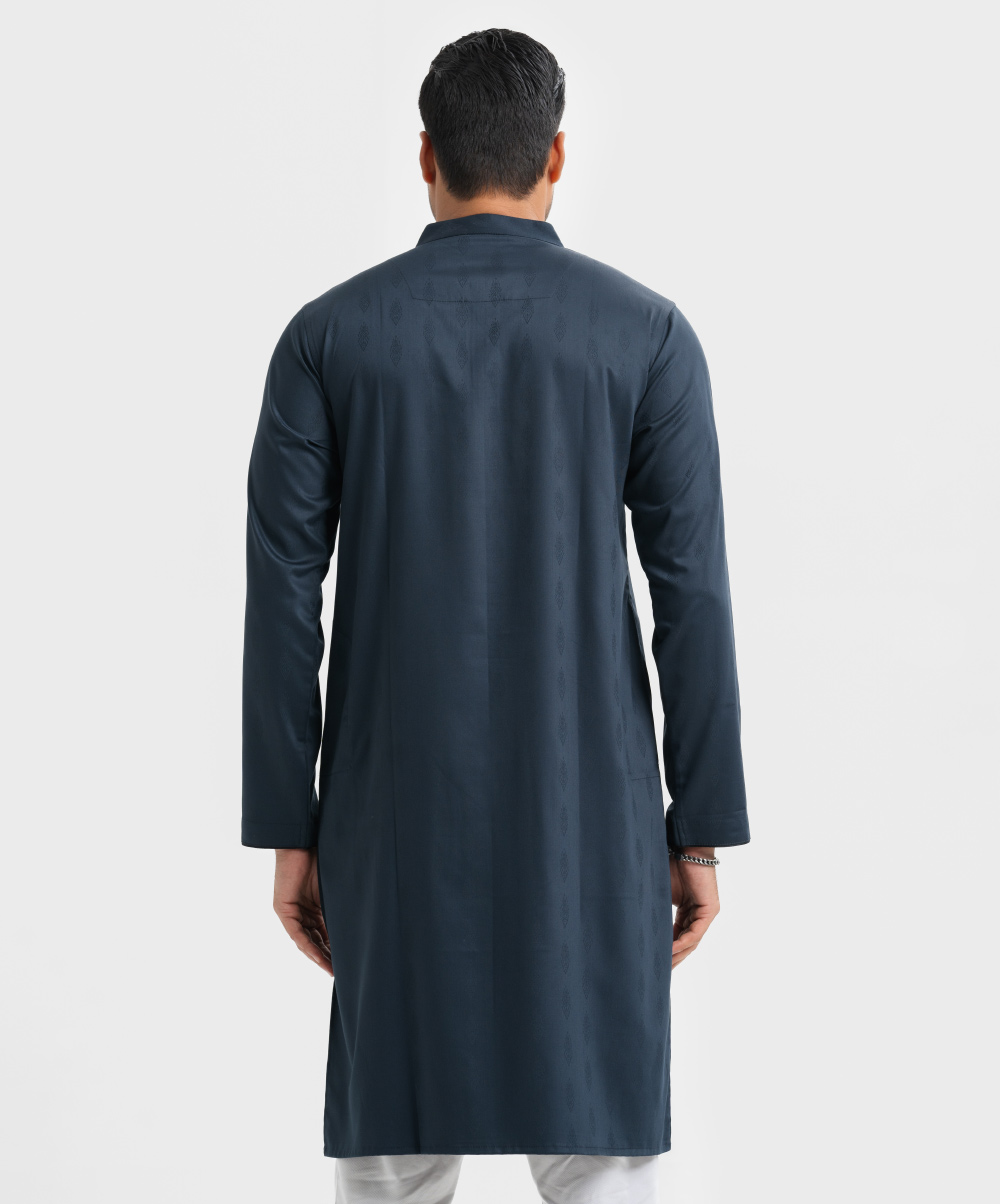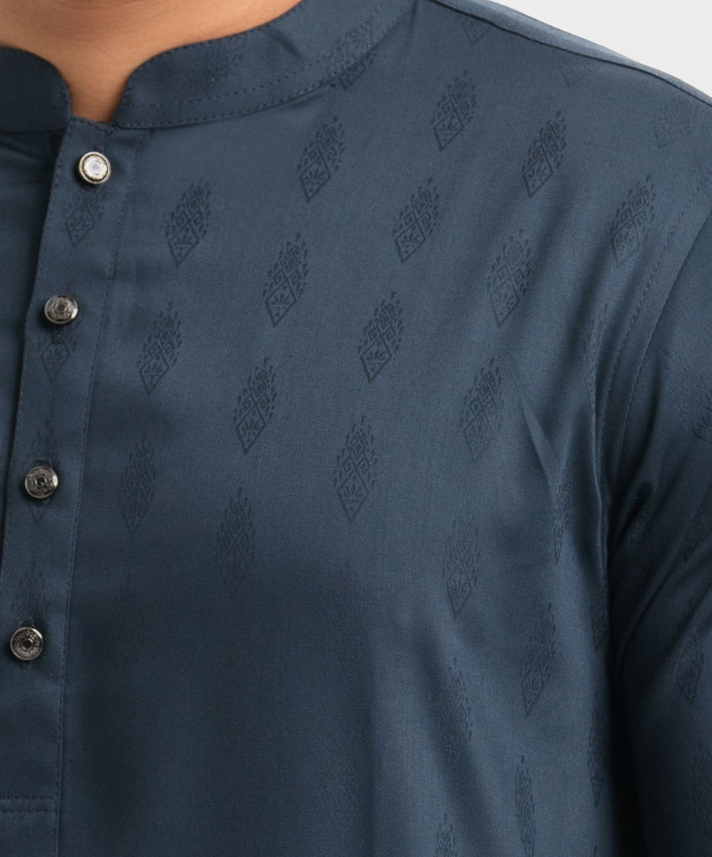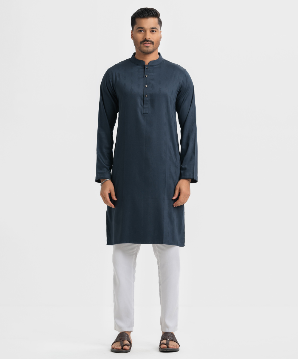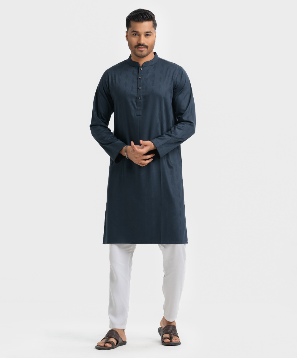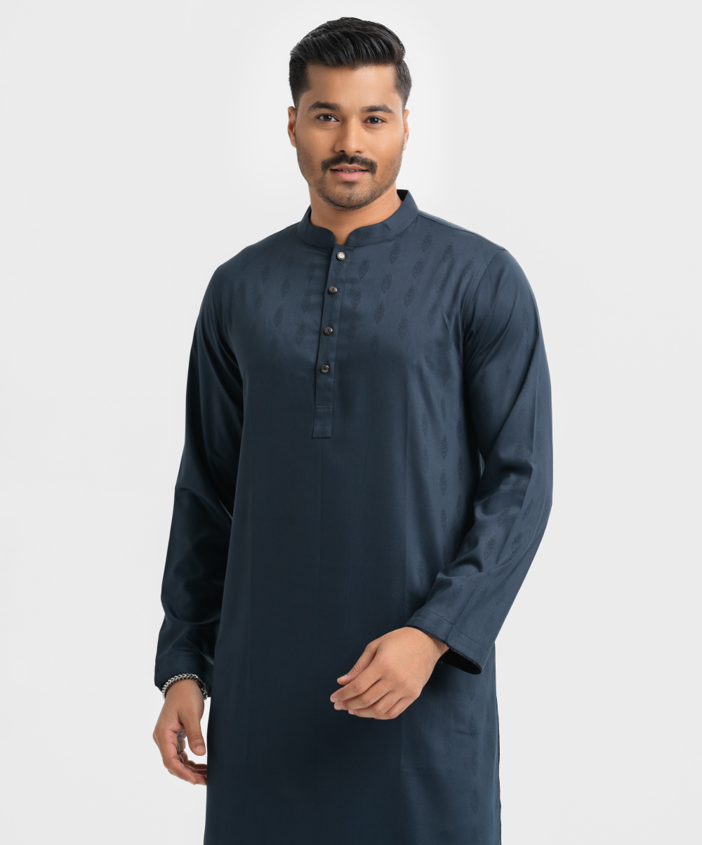 Men’s semi fitted panjabi in stretchable jacquard fabric. Mandarin collar with metal buttons on the placket & full sleeves.