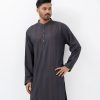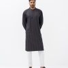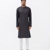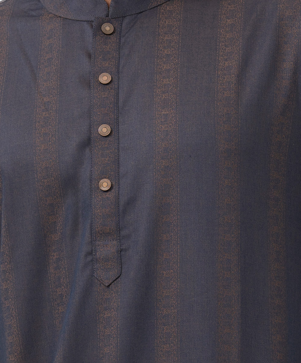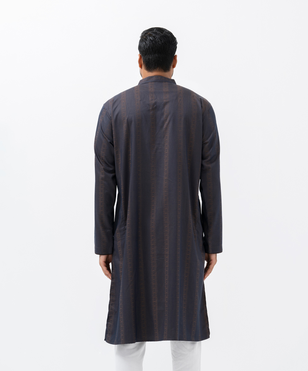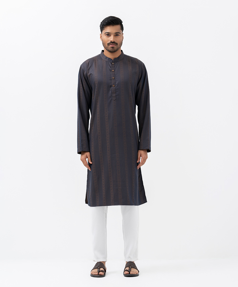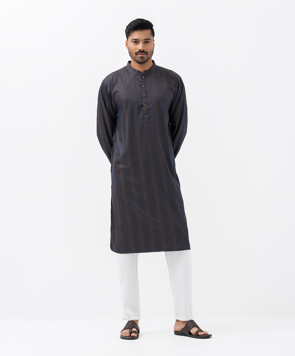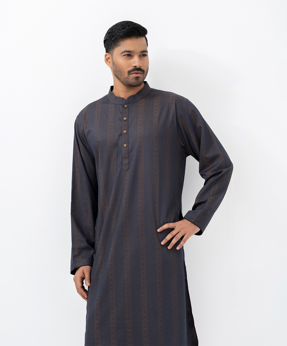 Men’s slim-fitted panjabi in jacquard fabric. Mandarin collar, inseam pockets and long sleeves.