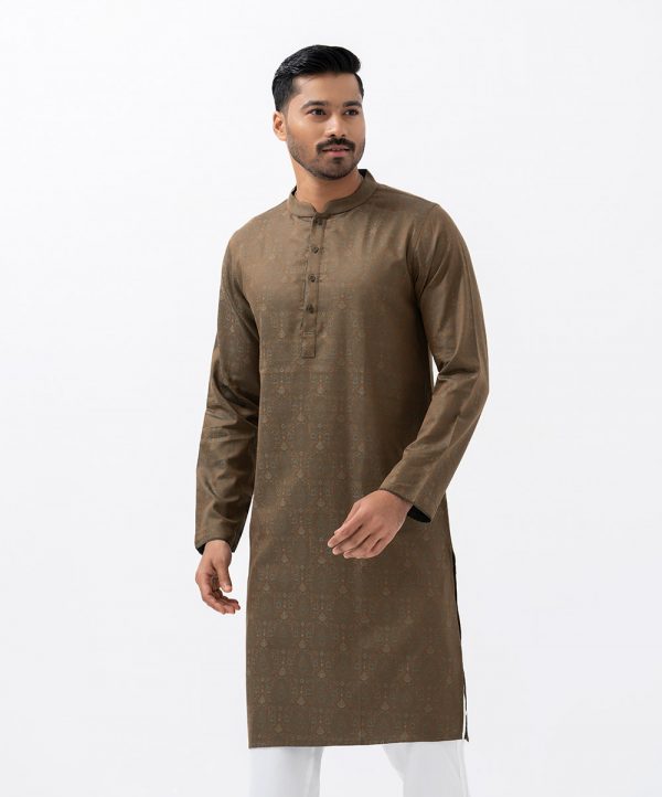 Men’s semi fitted panjabi in jacquard fabric. Mandarin collar, inseam pockets and long sleeves.