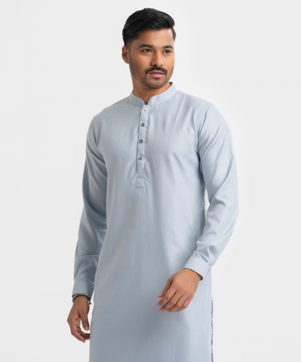 Men’s semi fitted panjabi in jacquard fabric. Mandarin collar with metal buttons on the placket & cuff sleeves. Inseam pockets.