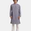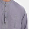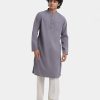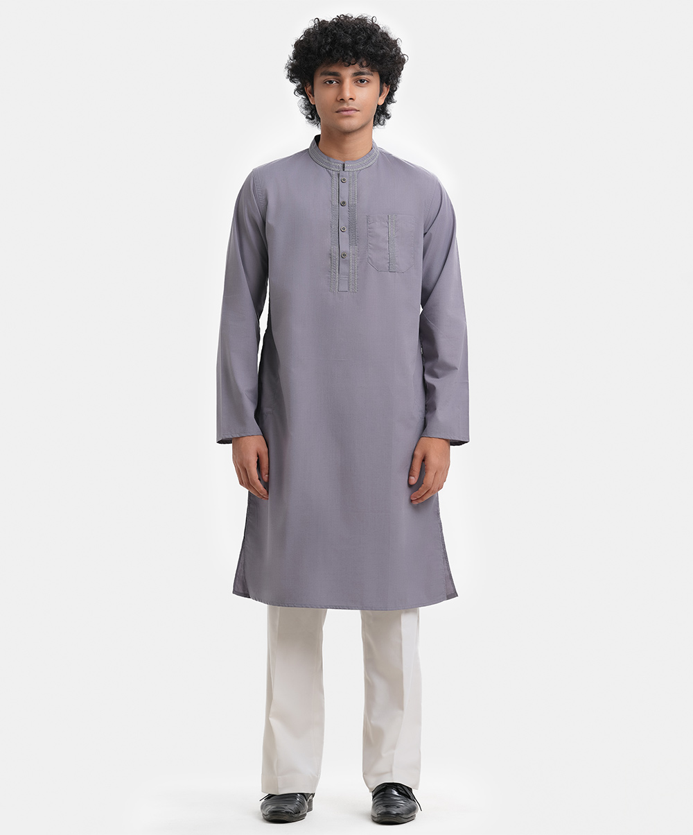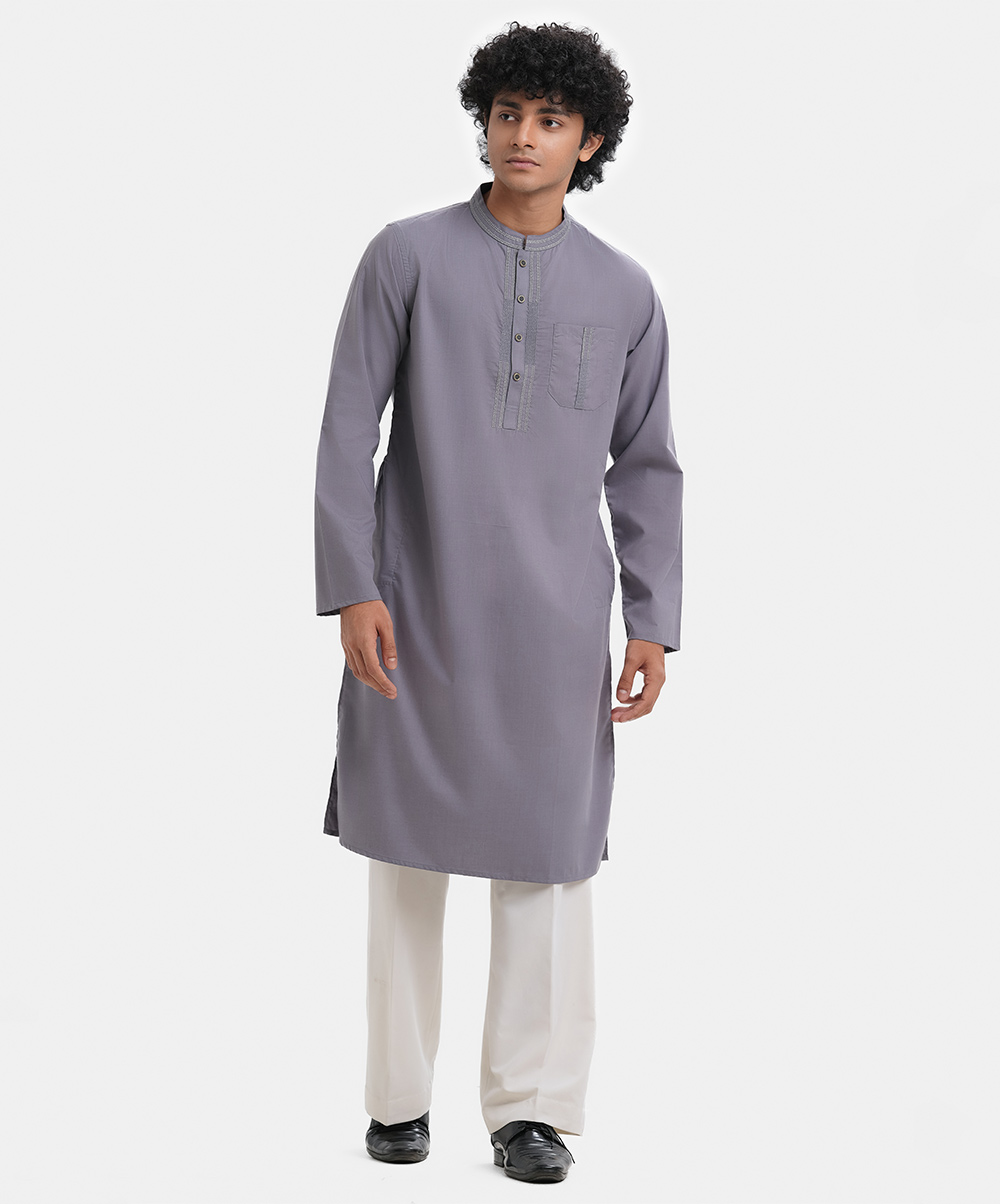 Men’s single color semi fitted panjabi in cotton blended fabric. Embroidery at mandarin collar, buttons placket side and front pocket. Full sleeves & inseam side pockets.