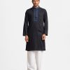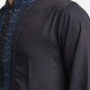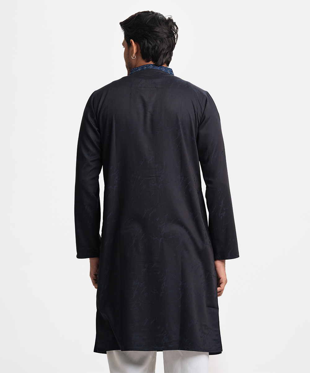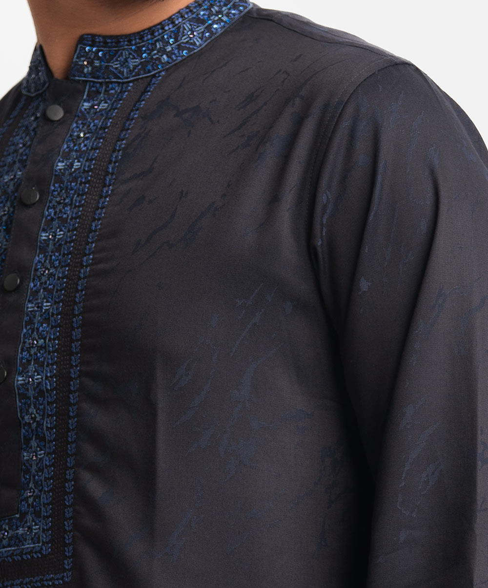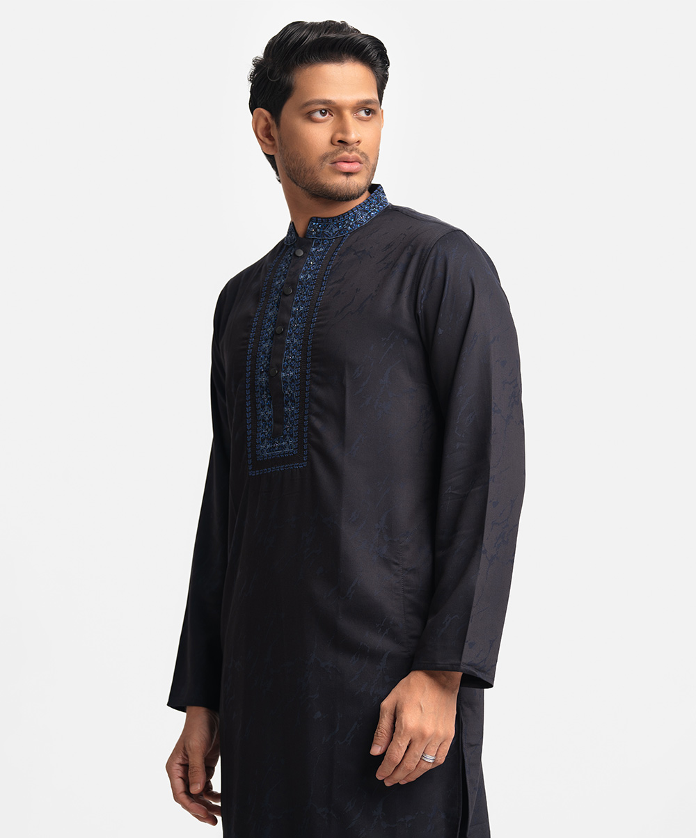Men’s semi fitted panjabi in jacquard fabric. Mandarin collar with metal buttons on the placket & full sleeves. Inseam pockets. Karchupi at front.