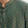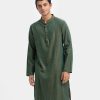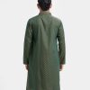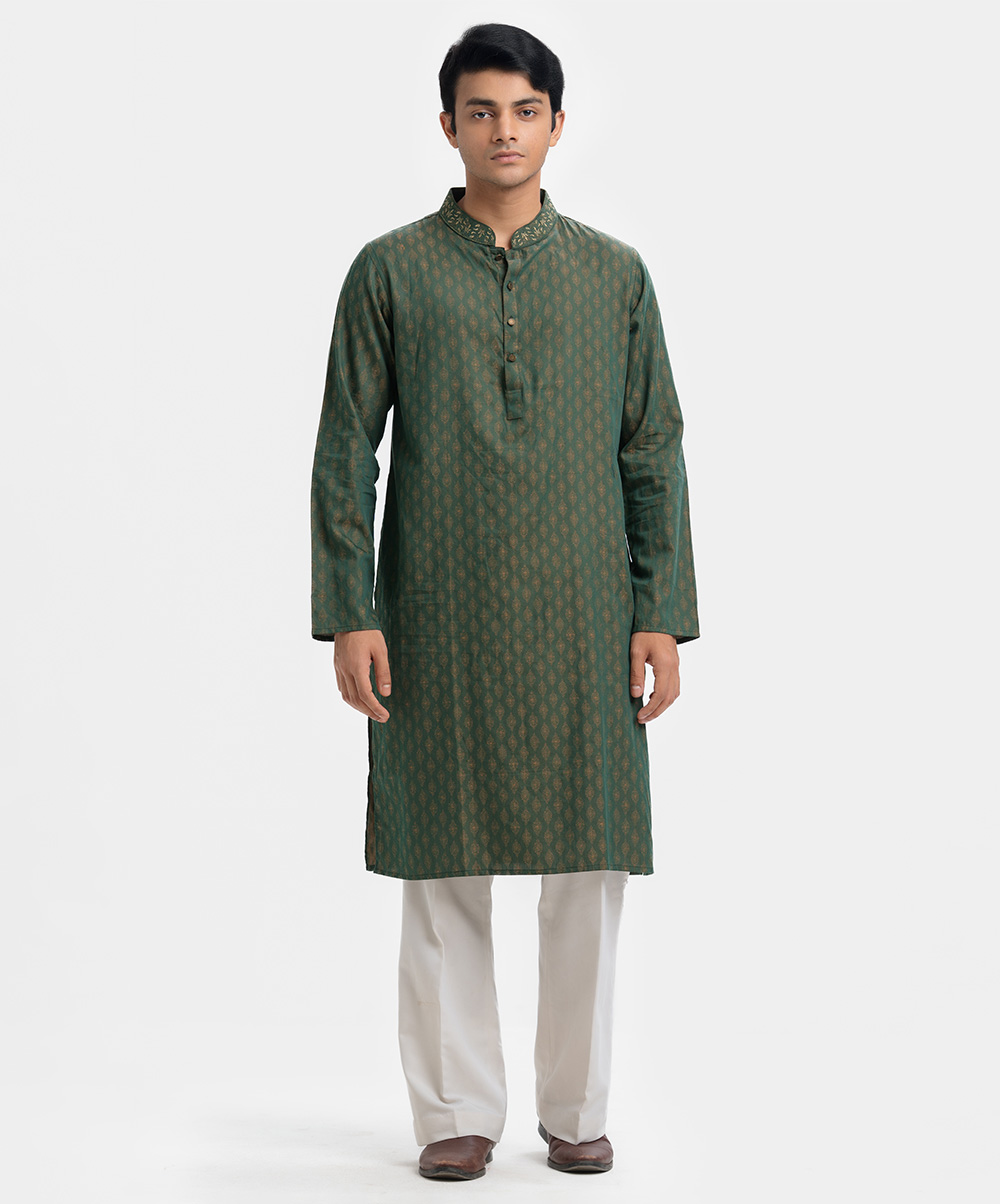Men’s semi fitted panjabi in cotton jacquard fabric. Embroidered mandarin collar with metal buttons on the placket & full sleeves.