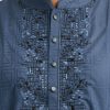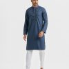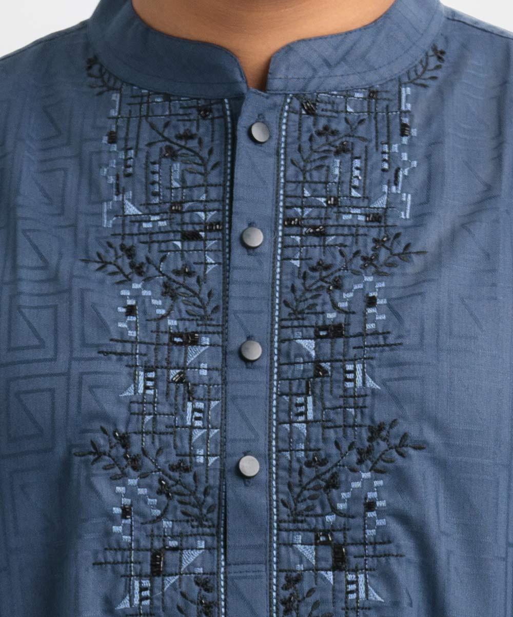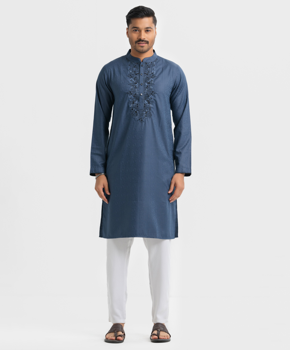 Men’s semi fitted panjabi in jacquard fabric. Mandarin collar with metal buttons on the placket & full sleeves. Karchupi at front.
