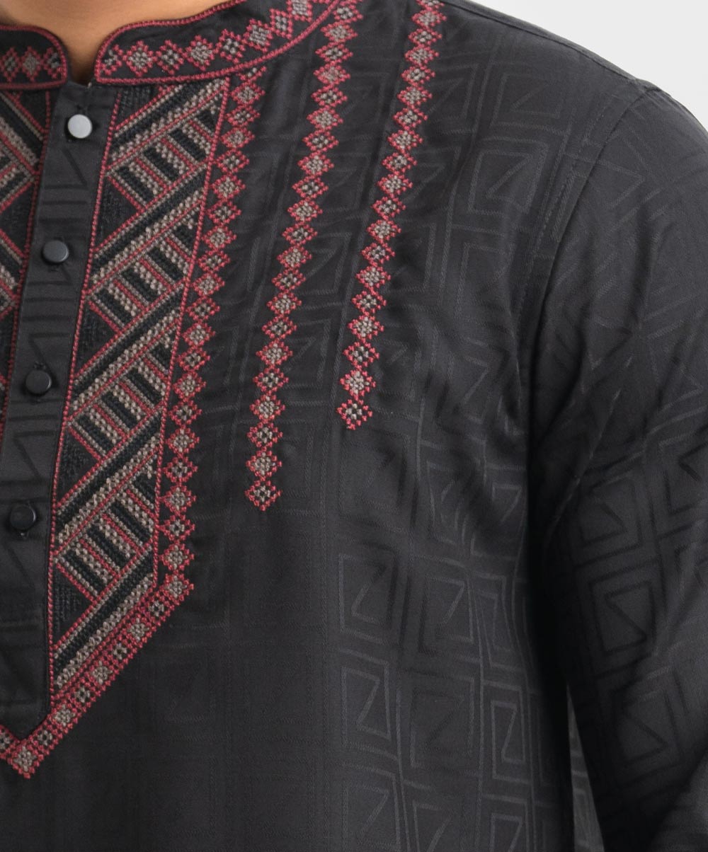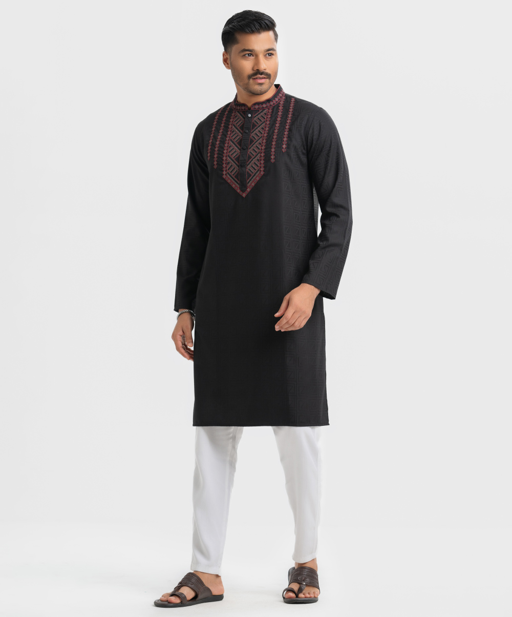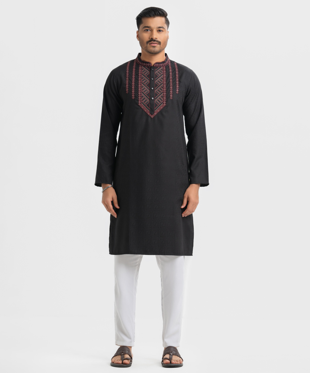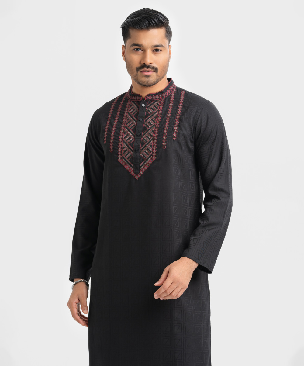 Men’s semi fitted panjabi in jacquard fabric. Mandarin collar with metal buttons on the placket & full sleeves. Embroidery at front.
