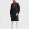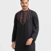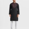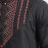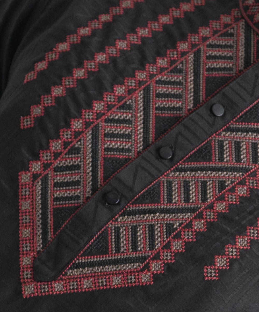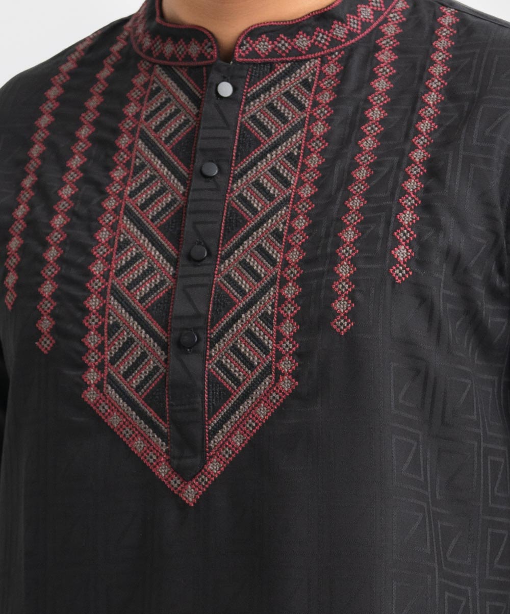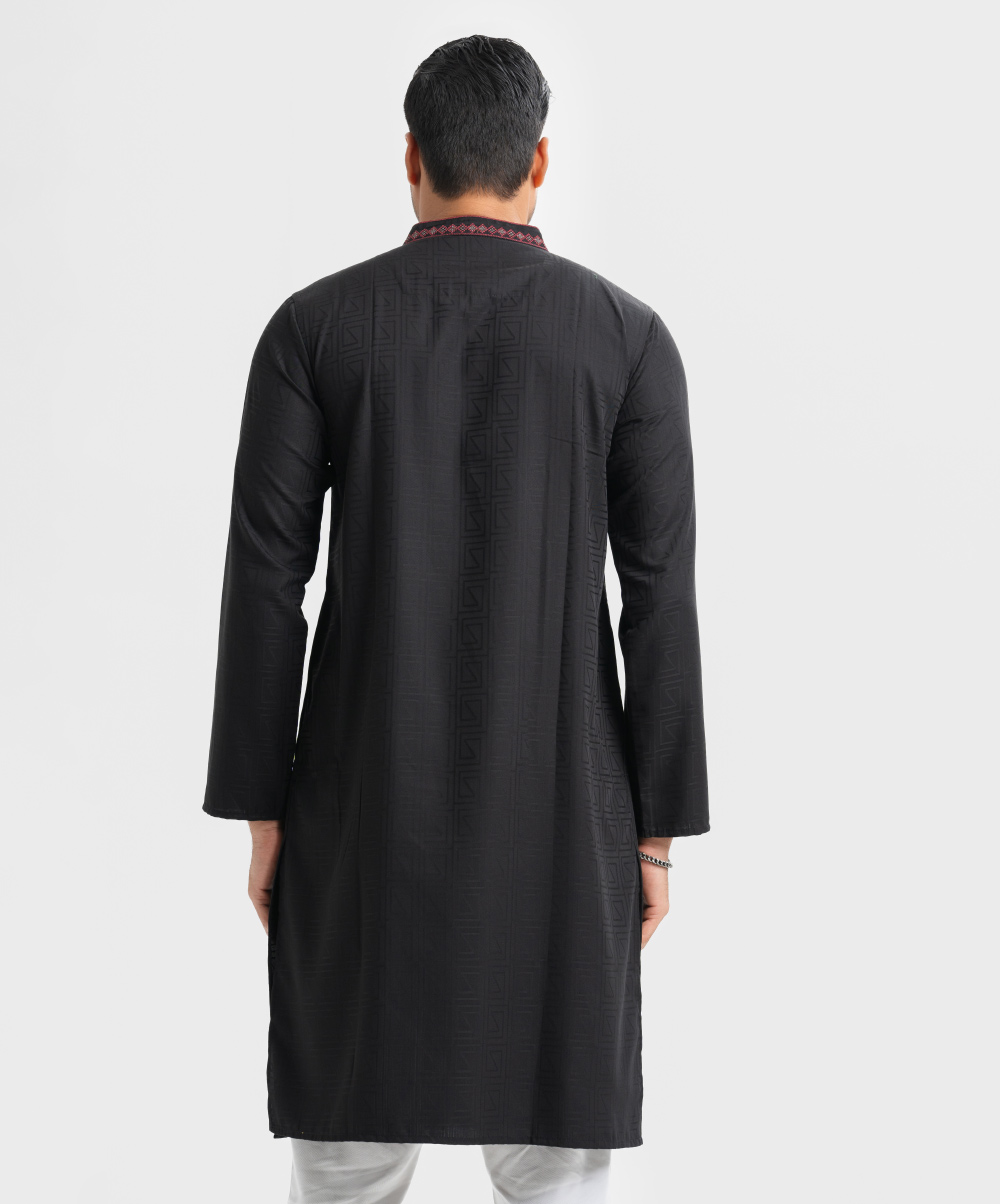 Men’s semi fitted panjabi in jacquard fabric. Mandarin collar with metal buttons on the placket & full sleeves. Embroidery at front.