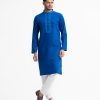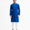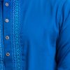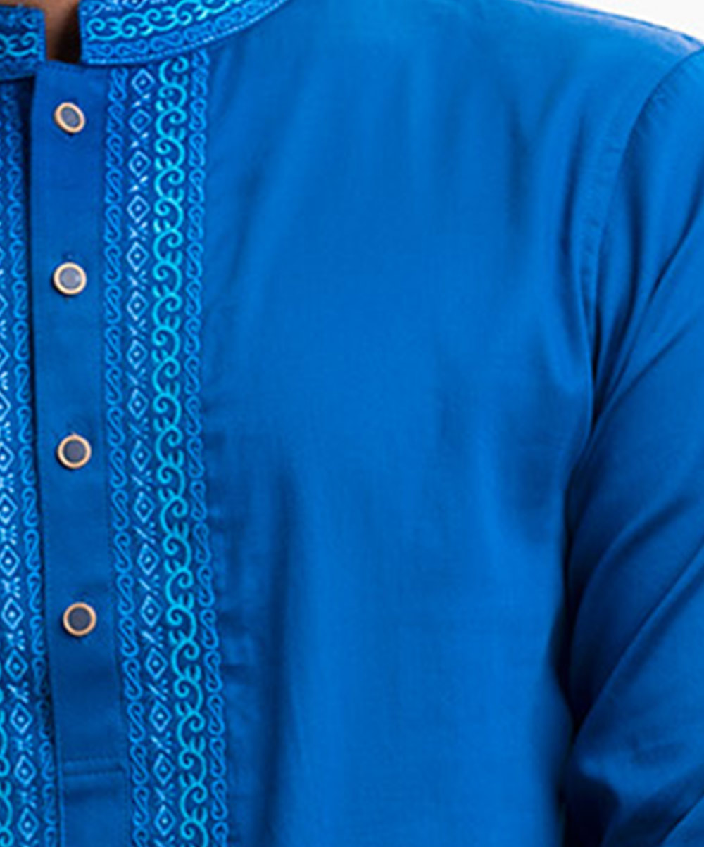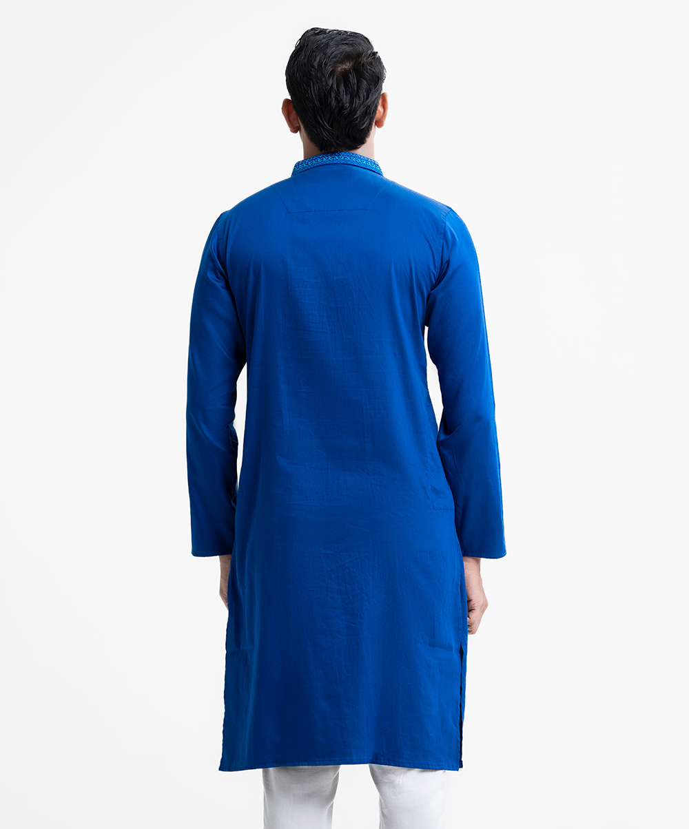 Men’s semi fitted panjabi in cotton fabric. Embroidery at mandarin collar with metal buttons on the placket & full sleeves. Inseam pockets.