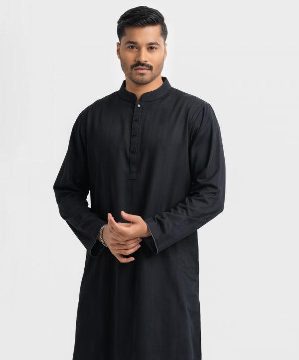 Men’s semi-fitted panjabi in jacquard fabric. Mandarin collar, inseam pockets and long sleeves.