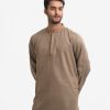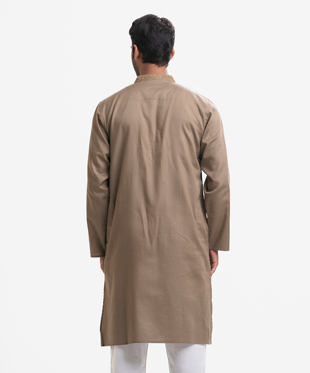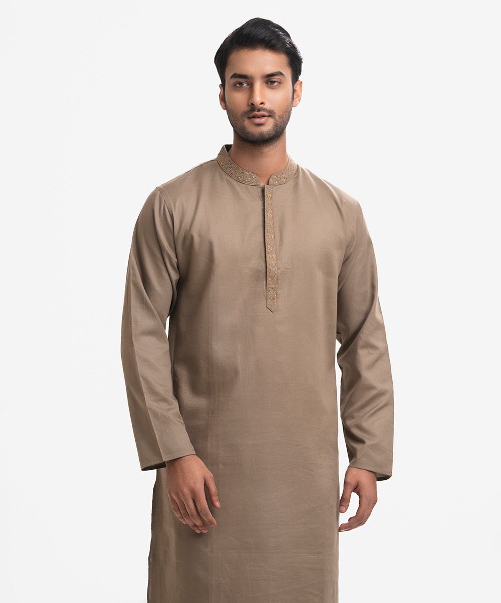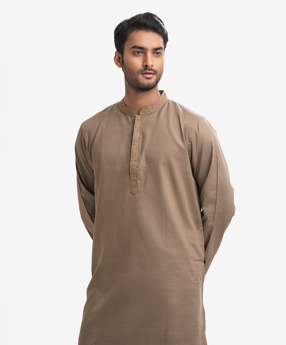 Men’s semi fitted panjabi in jacquard fabric. Long sleeves, inseam side pockets. Karchupi on the collar and placket.