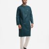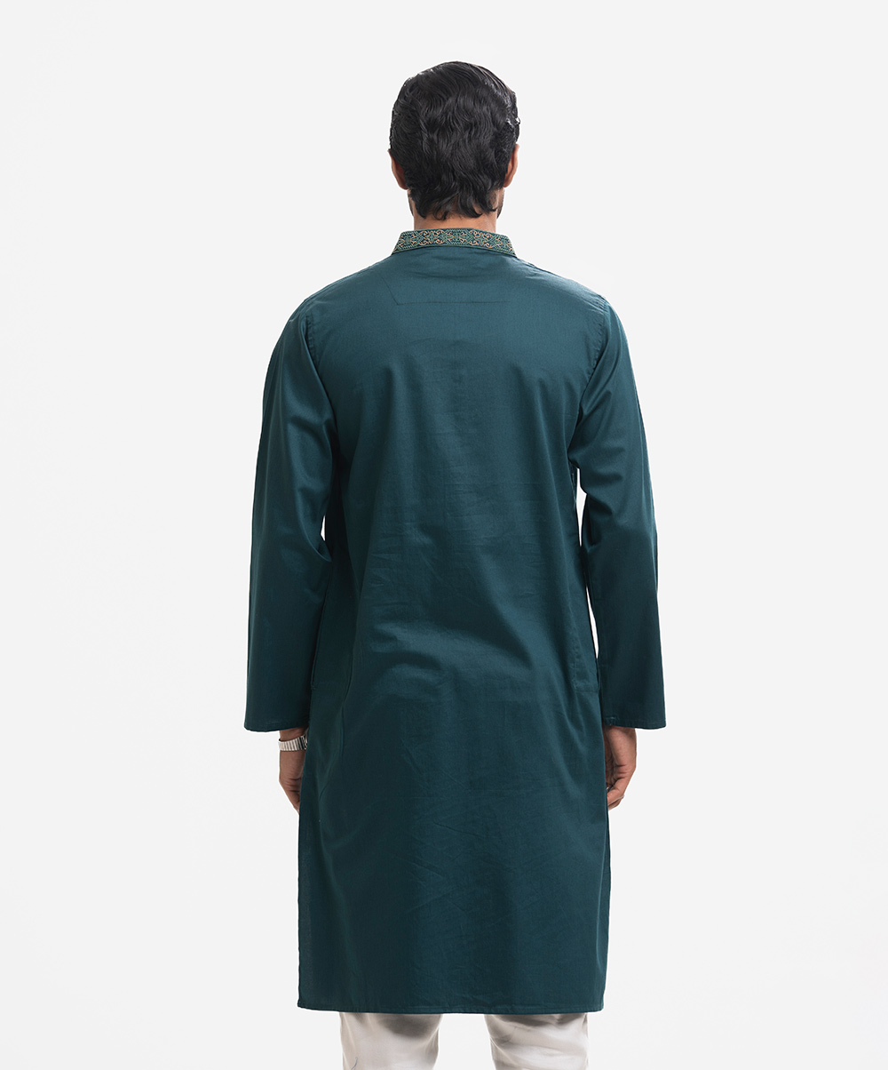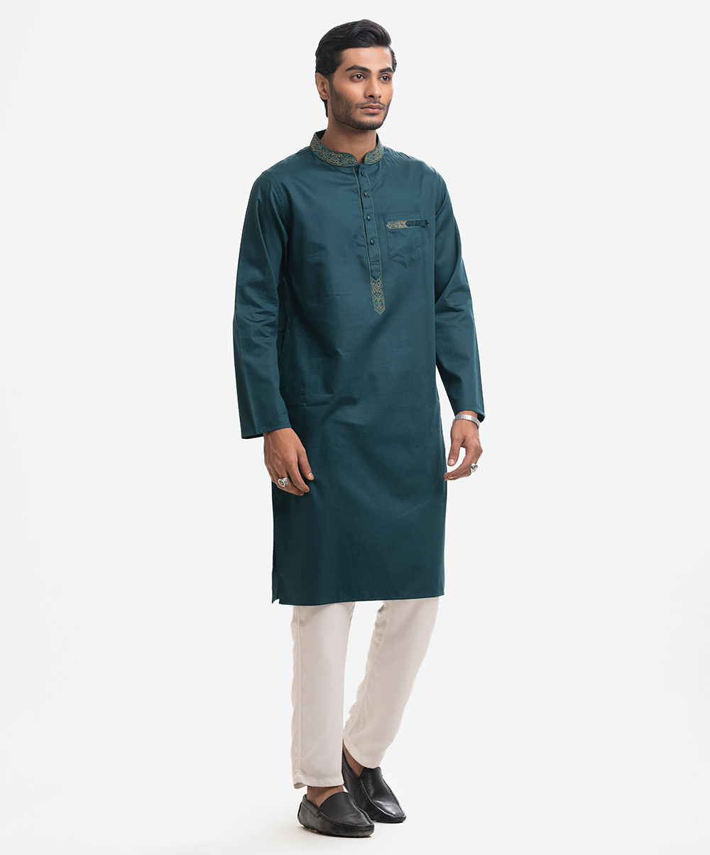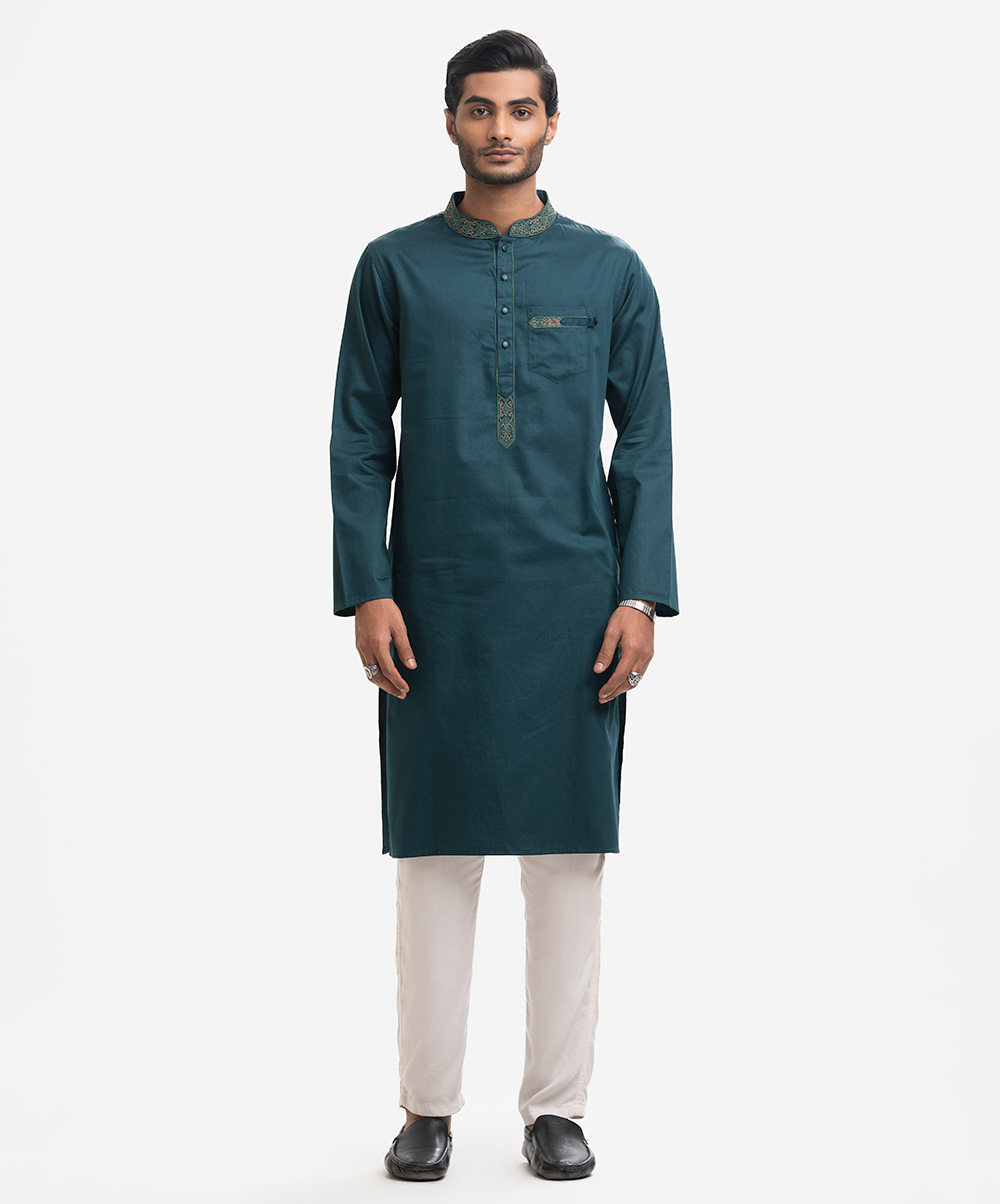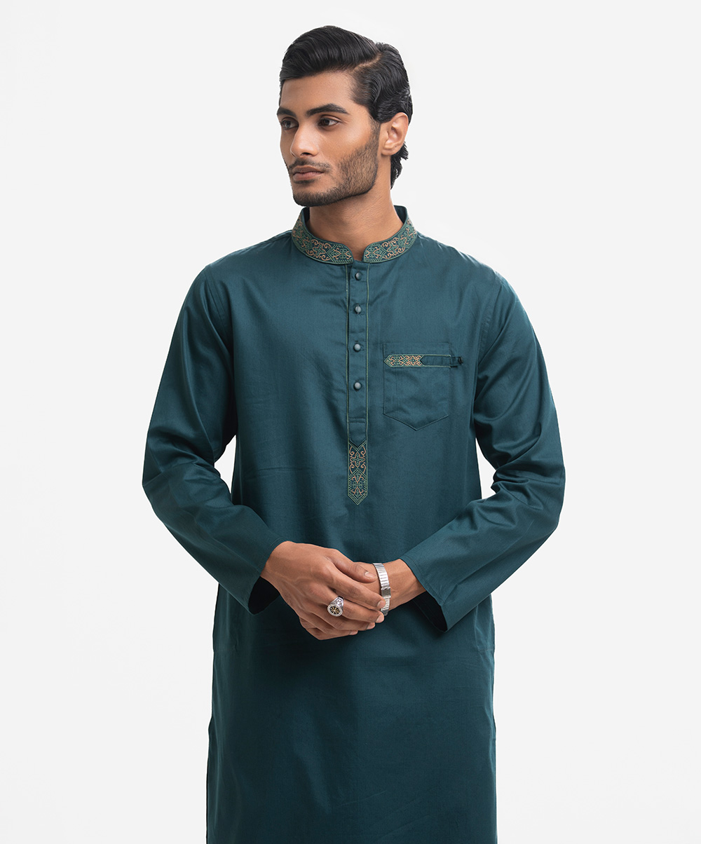 Men’s semi fitted panjabi in cotton fabric. Embroidery at mandarin collar, placket & the chest pocket. Inseam side pockets.