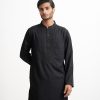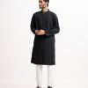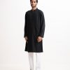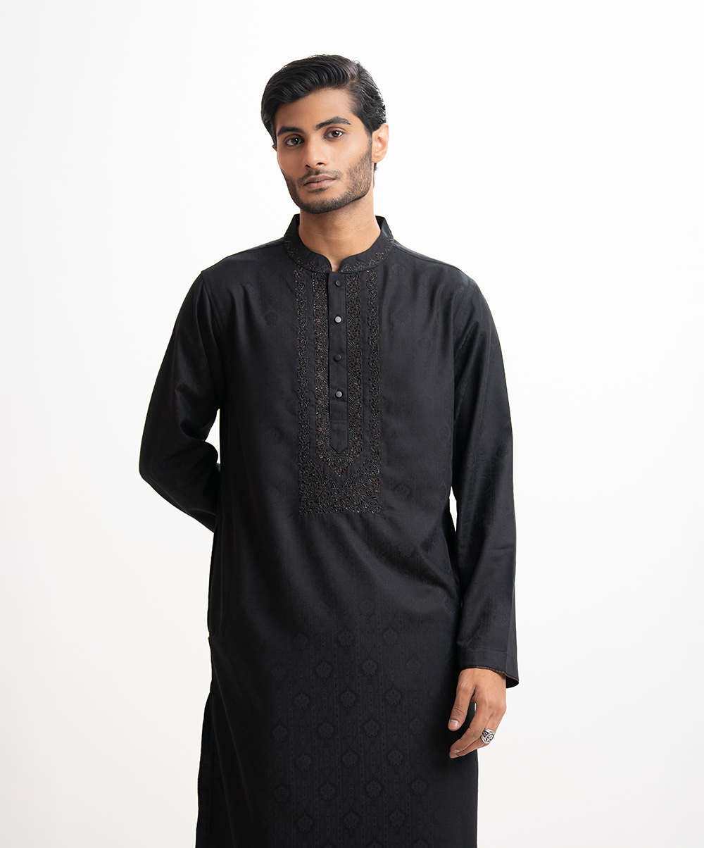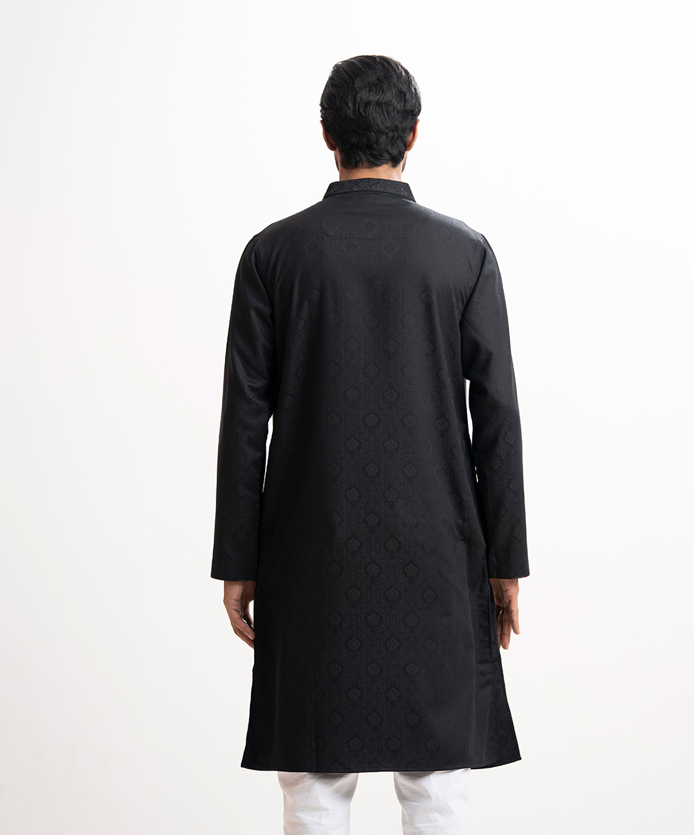 Men’s semi fitted panjabi in cotton jacquard fabric. Mandarin collar & metal buttons placket. Inseam side pockets. Heavy karchupi at front.