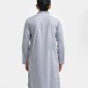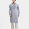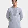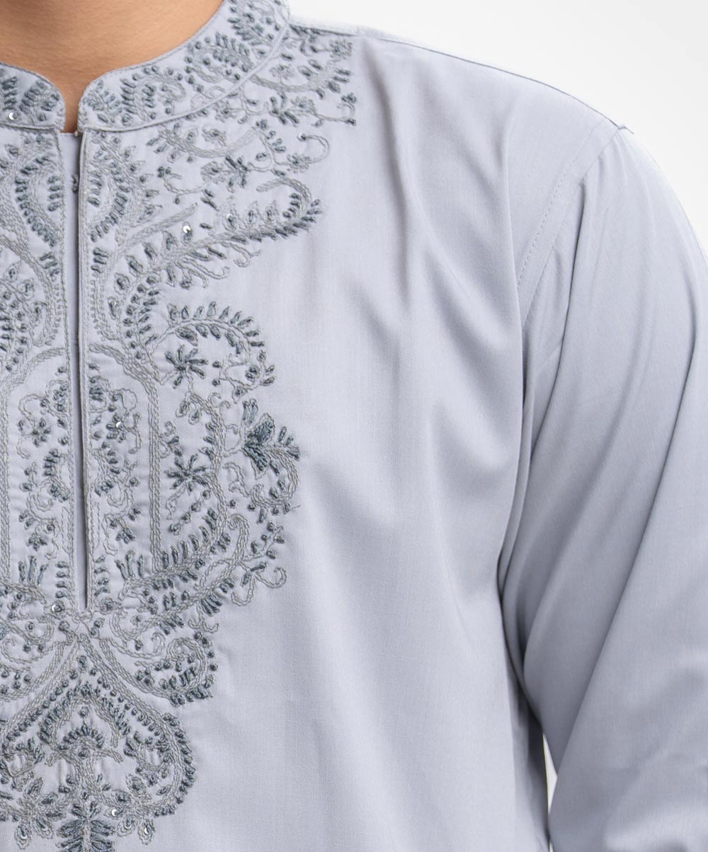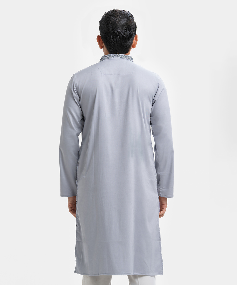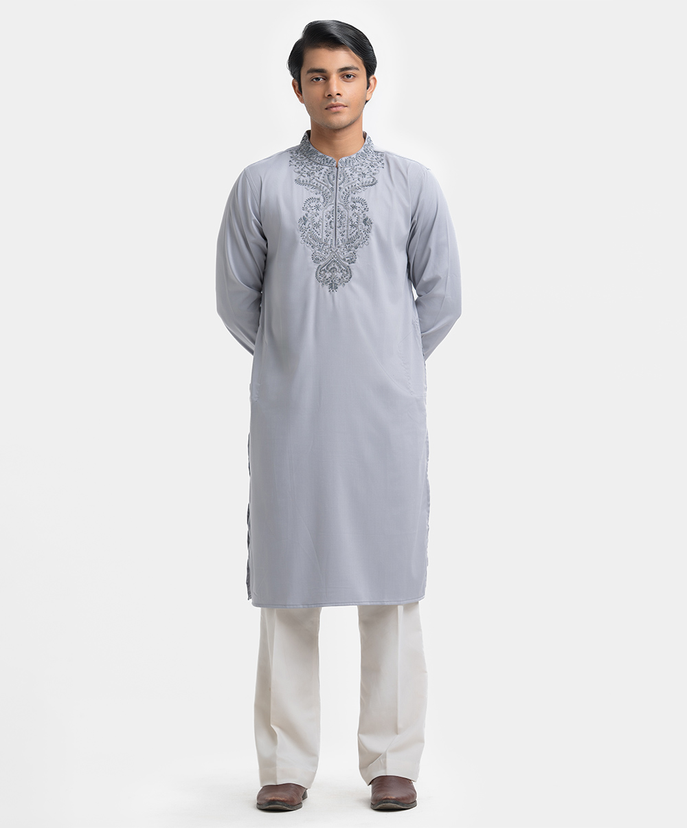 Men’s semi fitted panjabi in cotton blended fabric. Mandarin collar & metal buttons placket. Inseam side pockets. Karchupi at front.