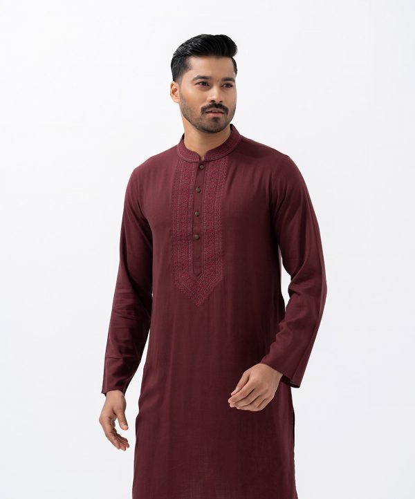 Men’s semi-fitted panjabi in viscose fabric. Embroidery at the mandarin collar & placket. Full sleeves and inseam pockets.