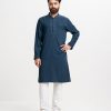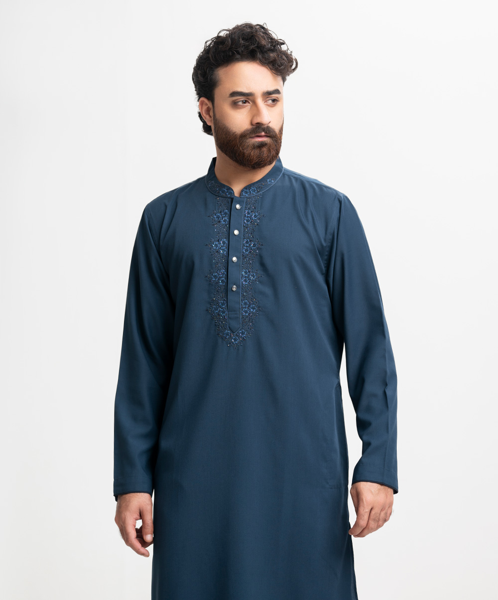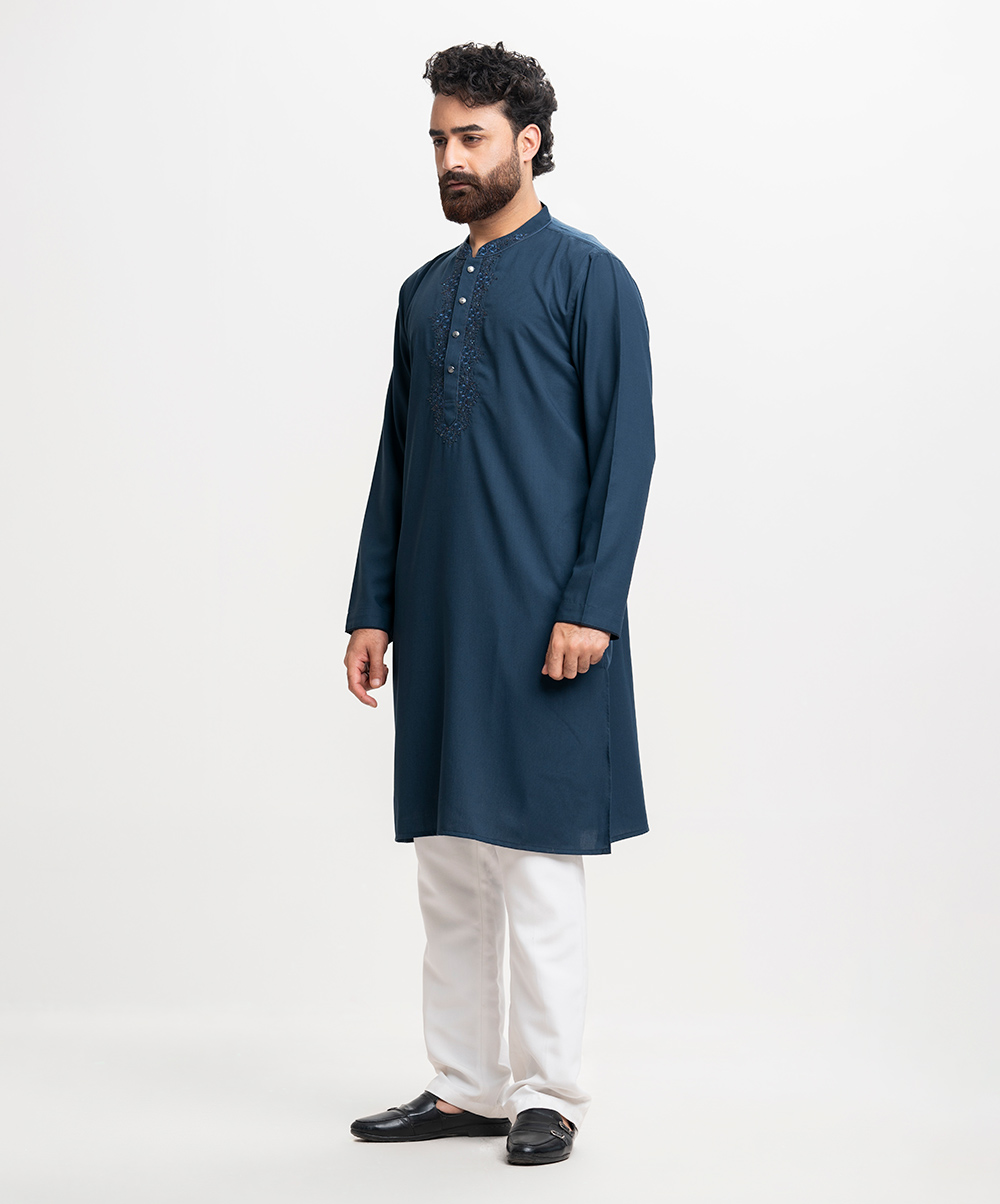 Classic semi-fitted panjabi in blended fabric.Karchupi on the collar and placket.