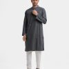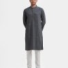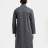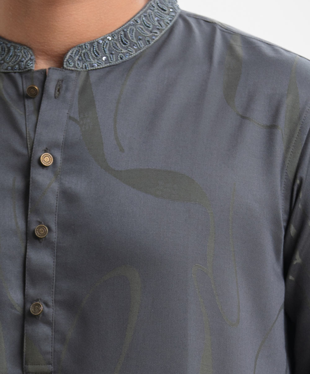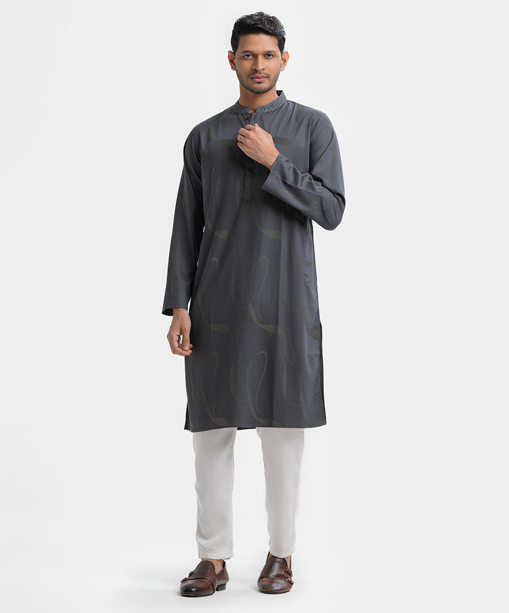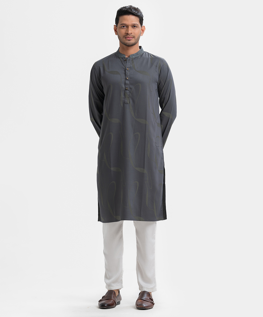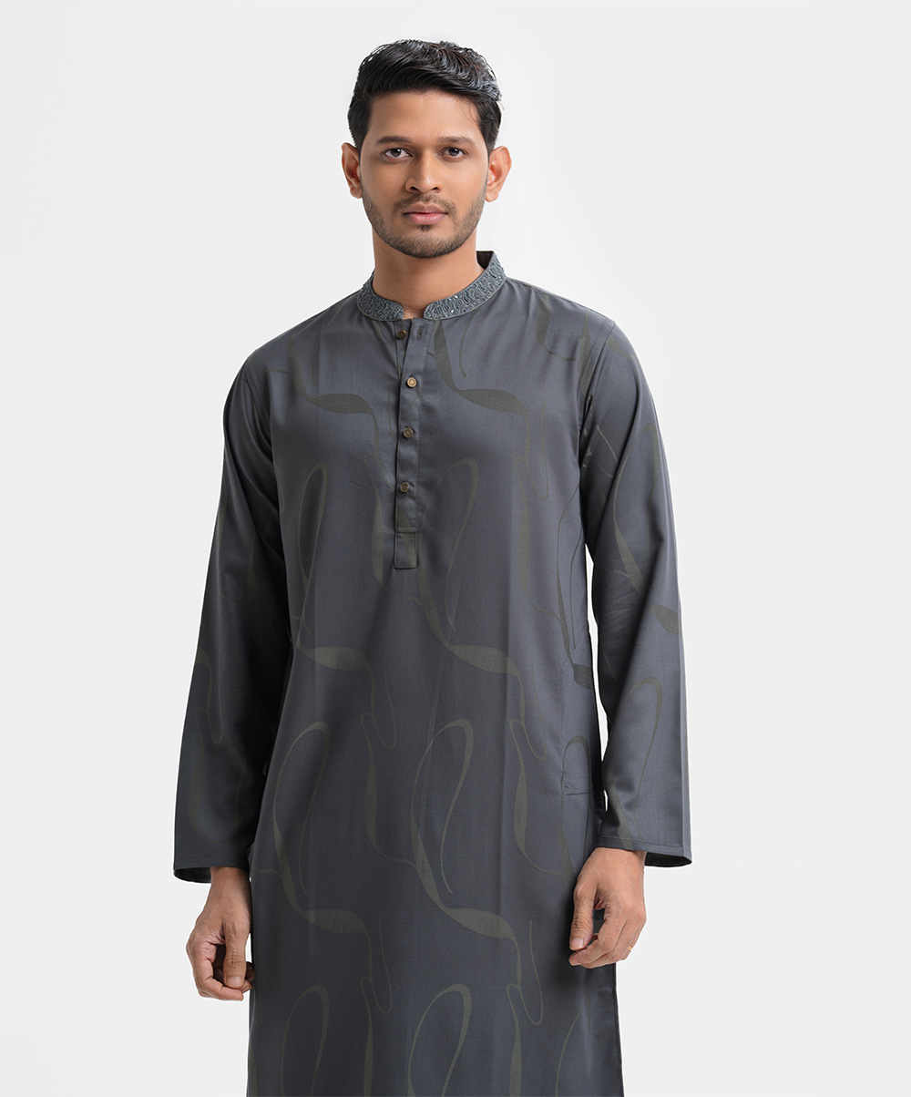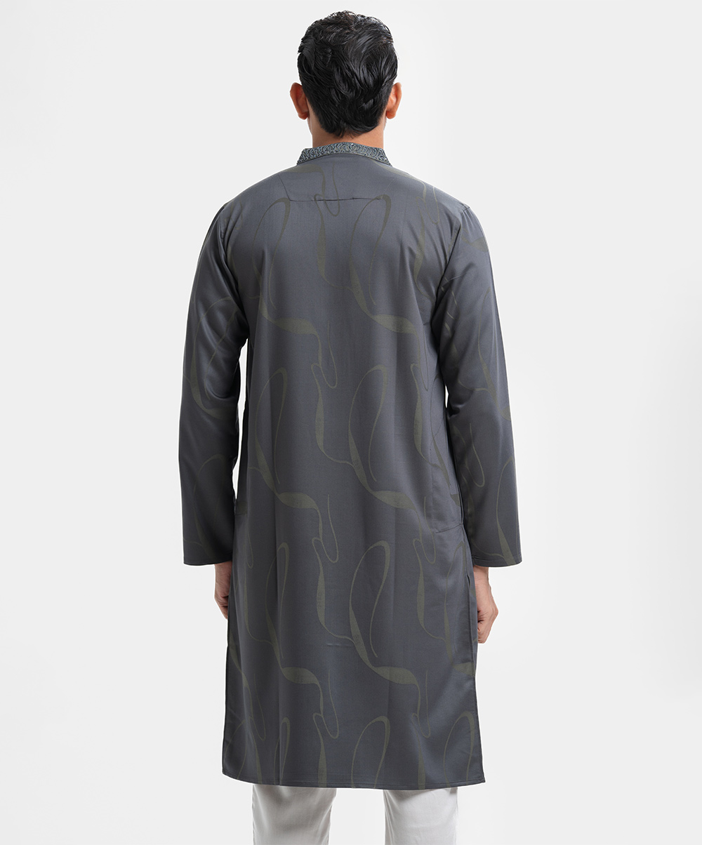 Men’s semi-fitted panjabi in jacquard fabric. Mandarin collar with embroidery, inseam pockets and long sleeves.