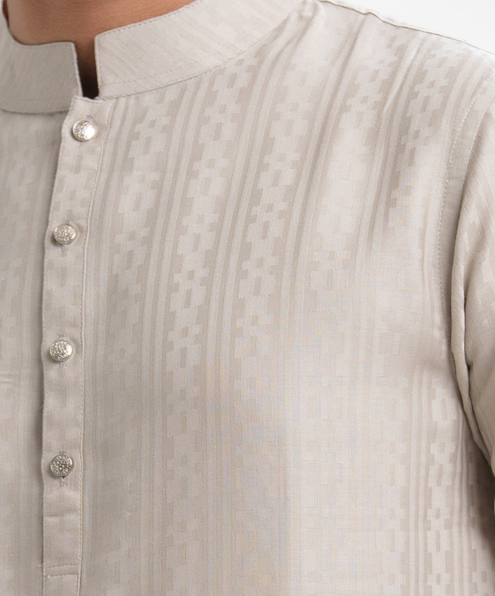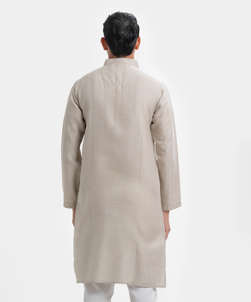 Men’s semi fitted panjabi in jacquard cotton fabric. Mandarin collar, buttons placket & full sleeves. Inseam pockets.