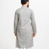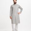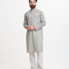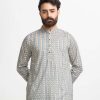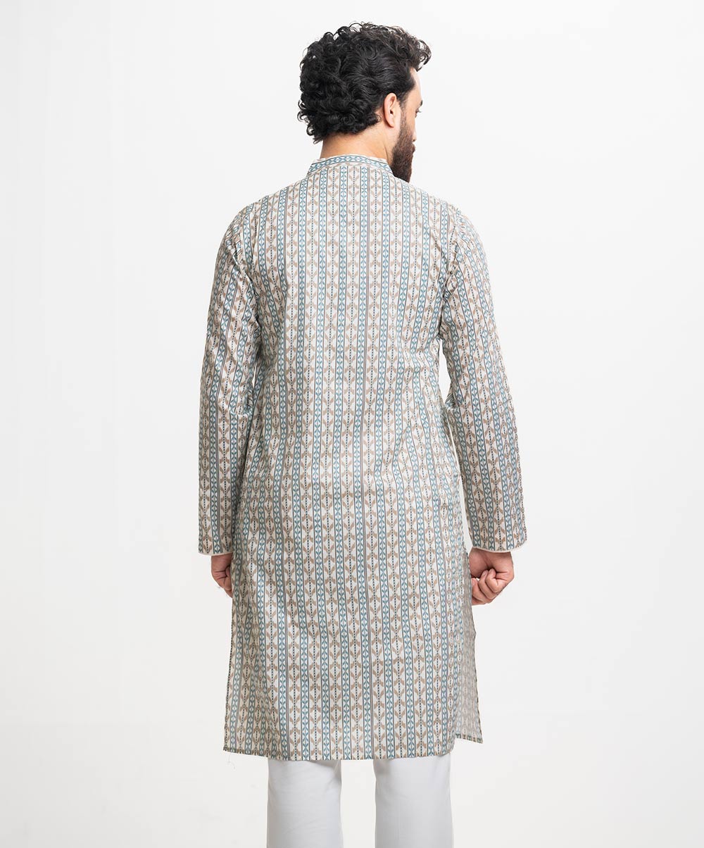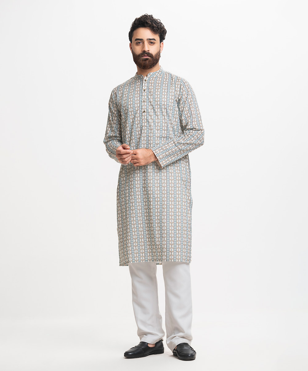 Men’s semi-fitted panjabi in cotton fabric. Mandarin collar & metal buttons placket. Full sleeves and inseam pockets.