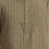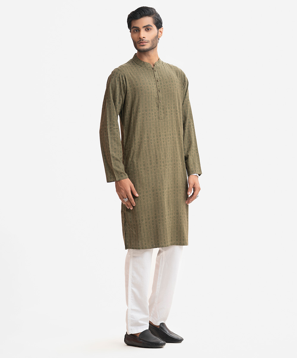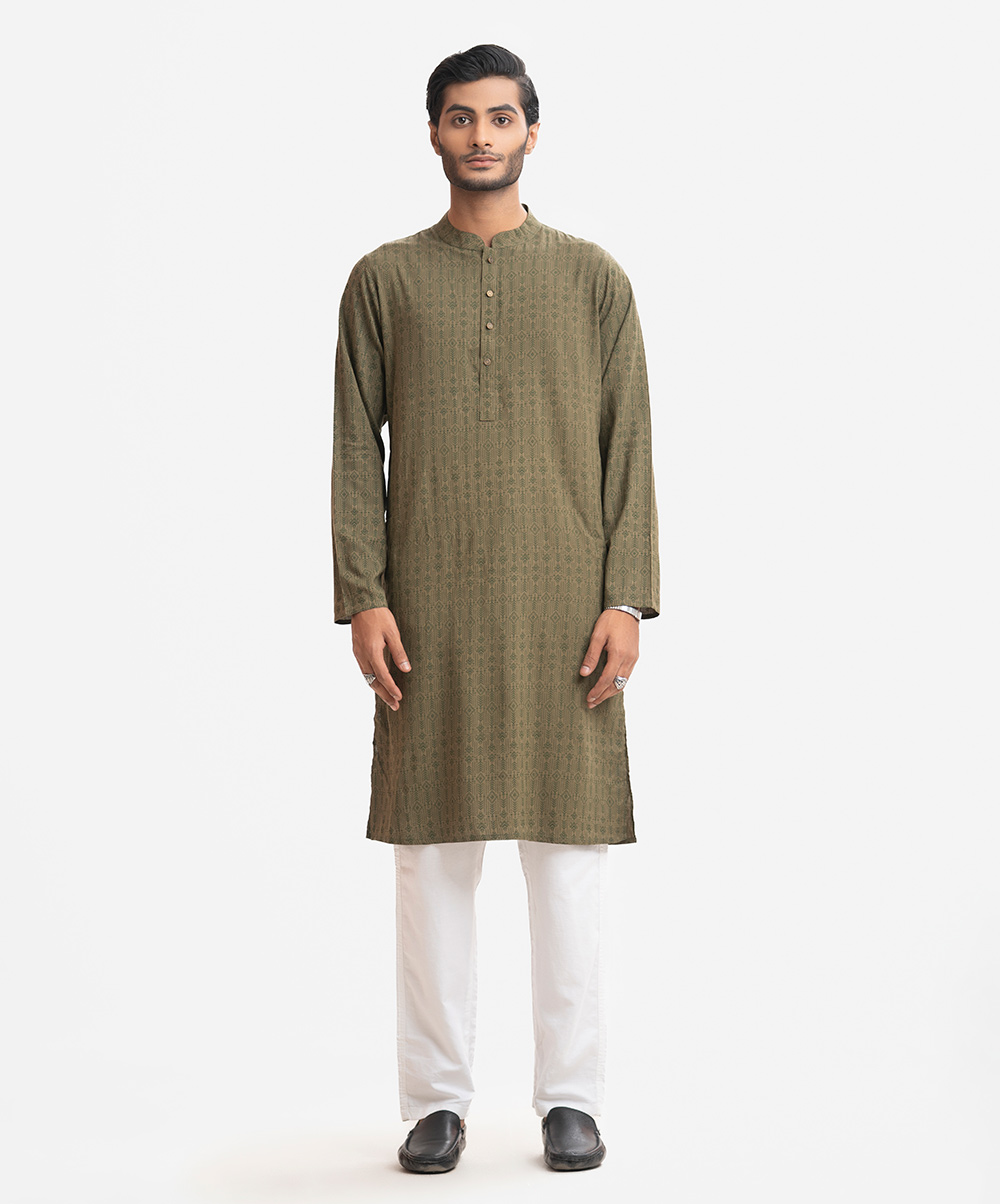 Men’s printed semi fitted panjabi in viscose fabric. Mandarin collar & placket. Full sleeves and inseam pockets.