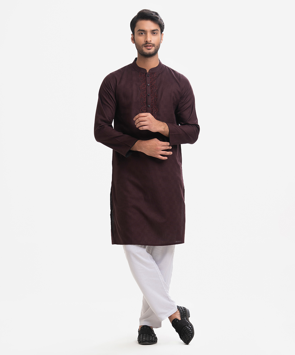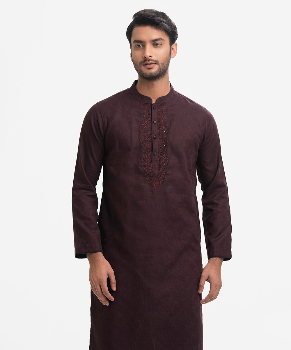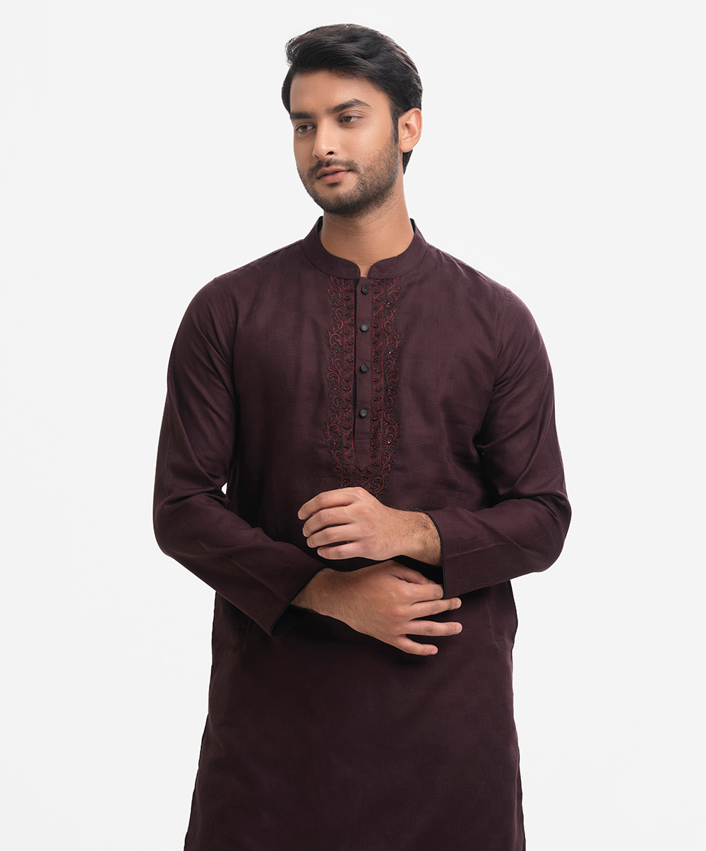Men’s semi fitted panjabi in cotton fabric. Mandarin collar & buttons placket. Inseam side pockets. Karchupi at front.