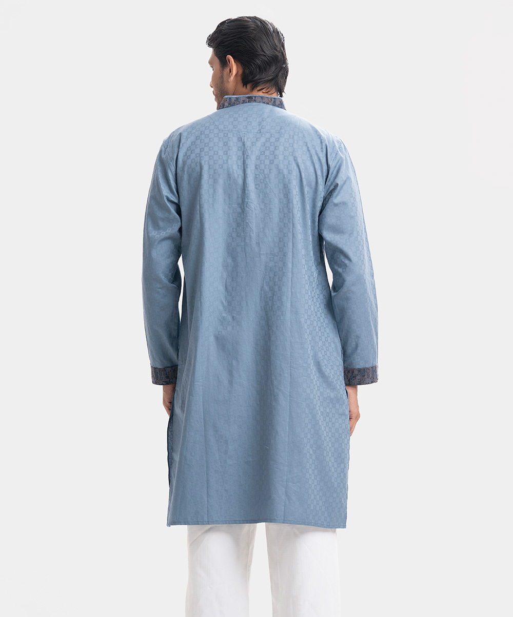 Semi-fitted cotton jacquard panjabi in cotton jacquard fabric. Matching patch on the collar and placket. Inseam side pockets.