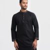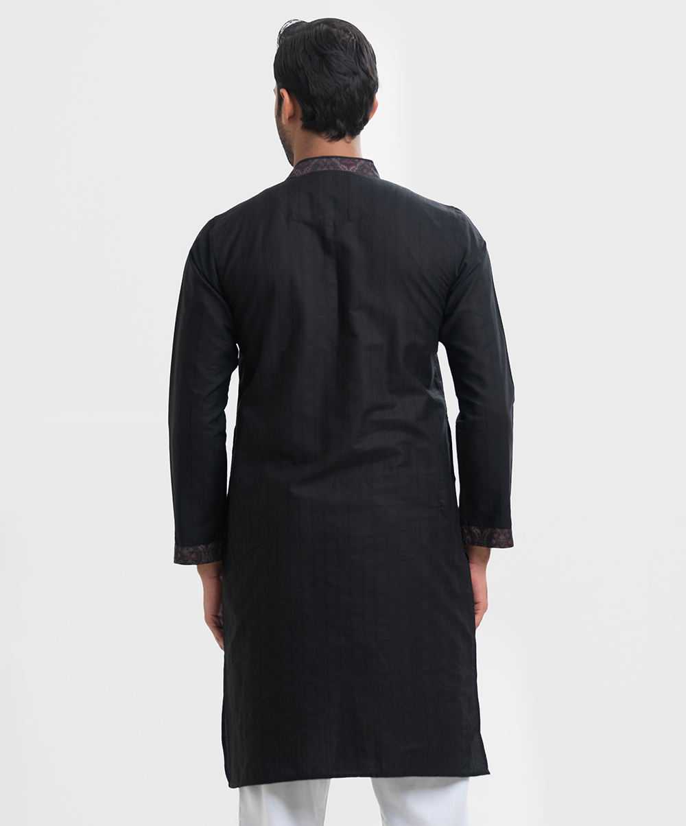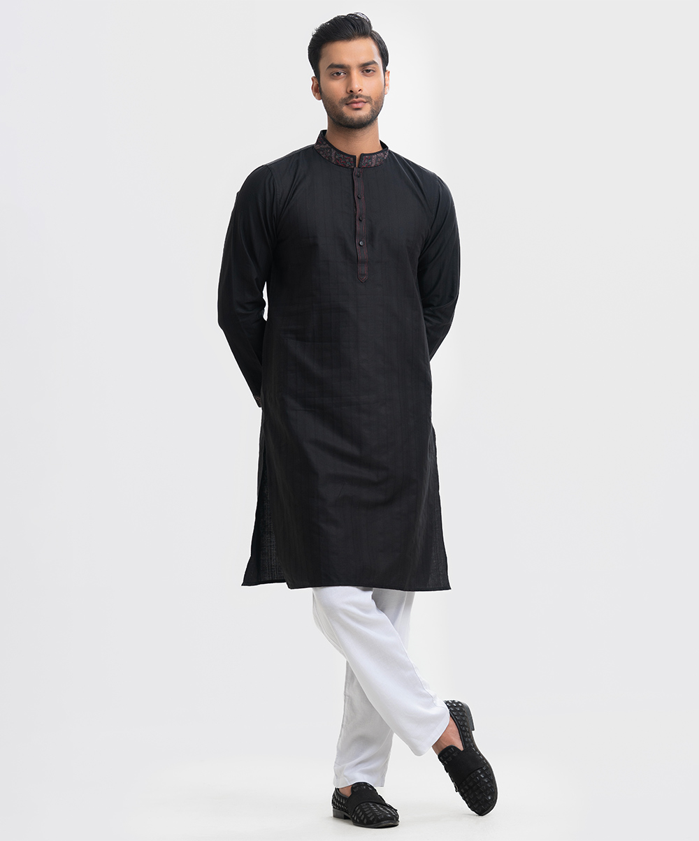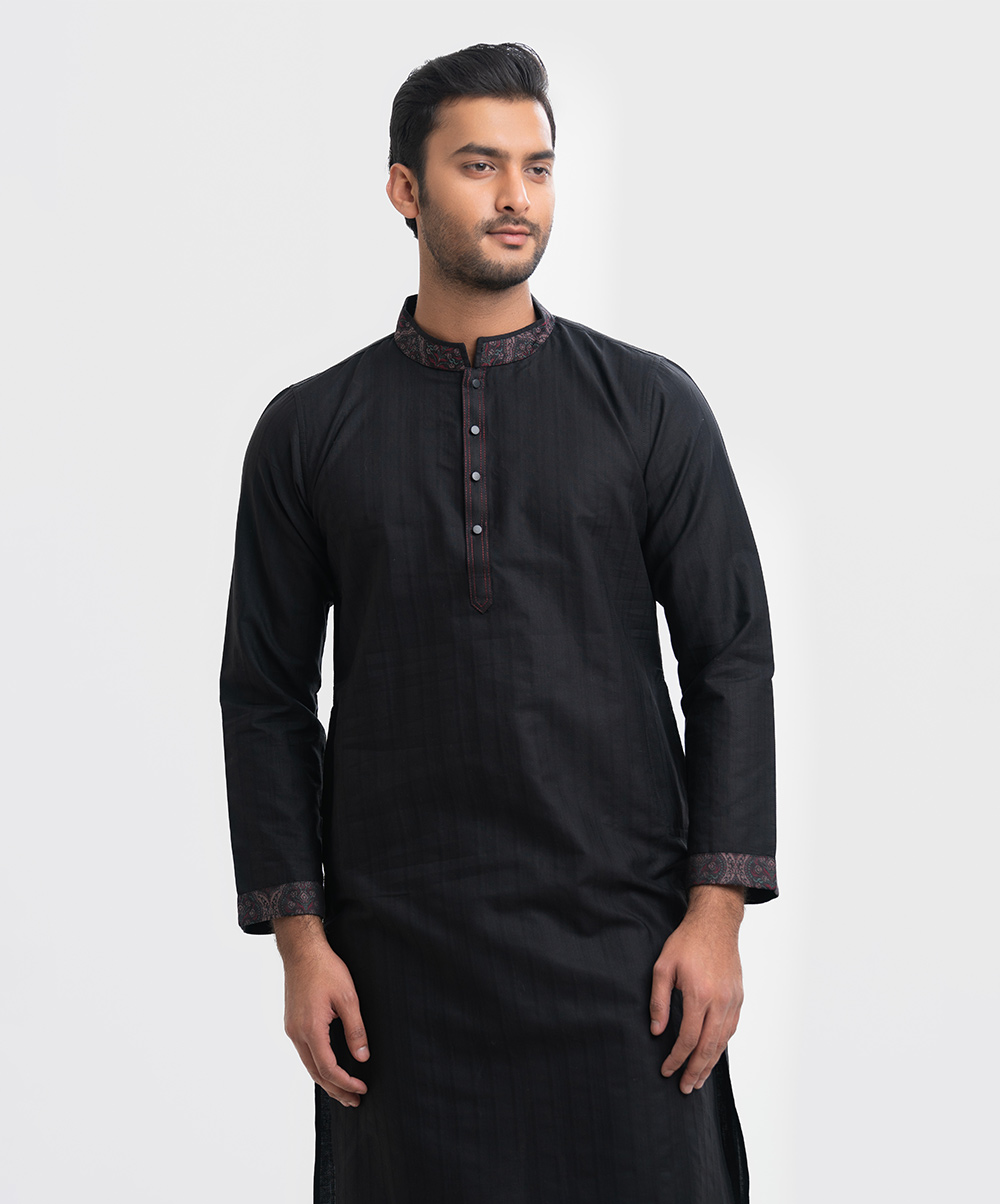Men’s semi fitted panjabi in jacquard fabric. Matching patch on the collar, full sleeves and inseam pockets.