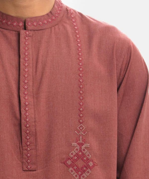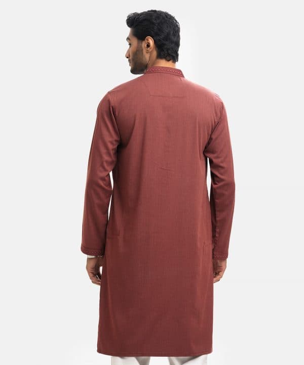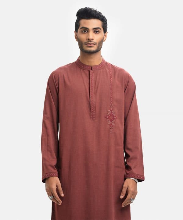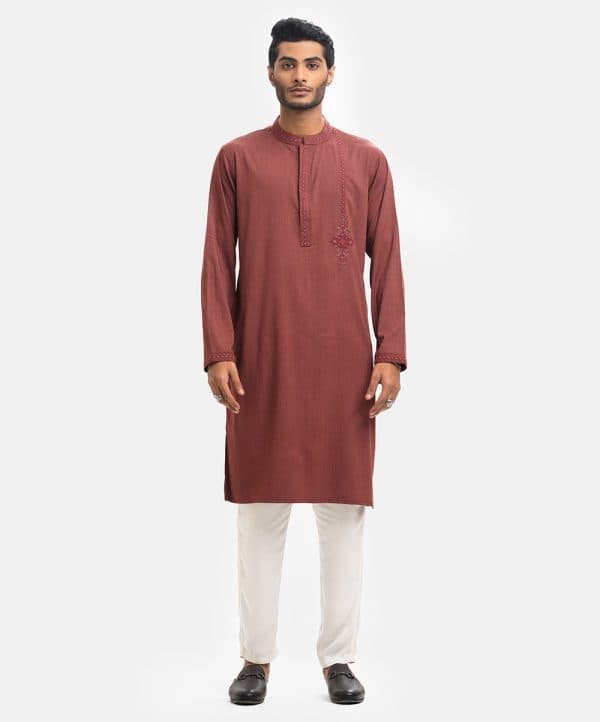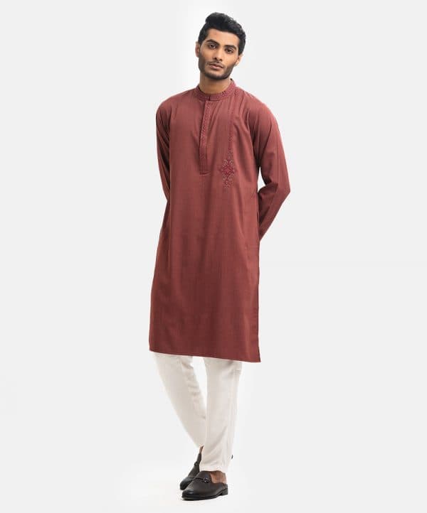 Men’s semi-fitted panjabi in blended fabric. Embroidery at the mandarin collar, placket & front side. Full sleeves and inseam pockets.