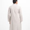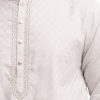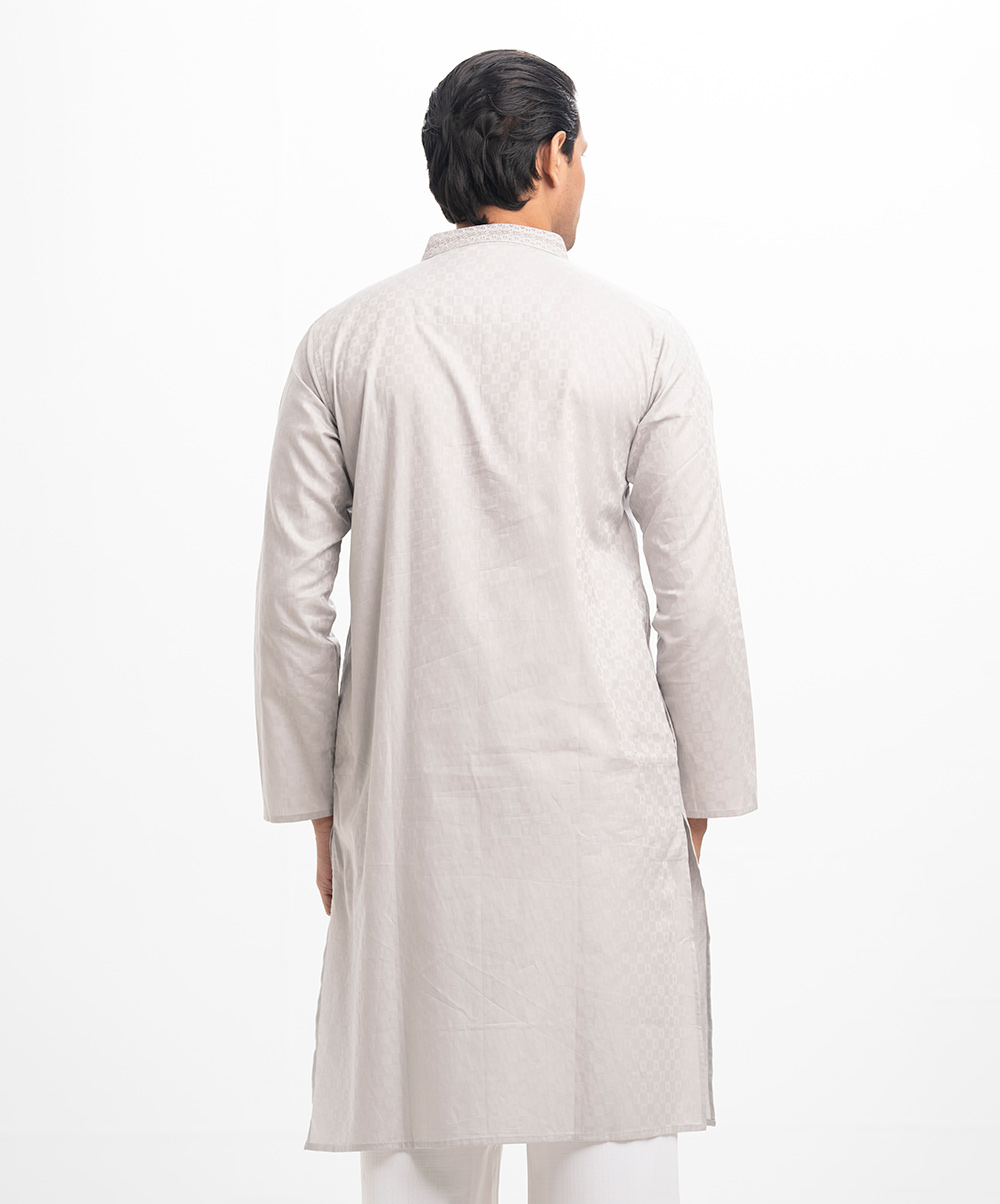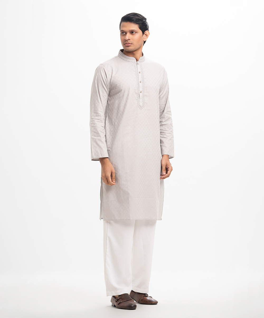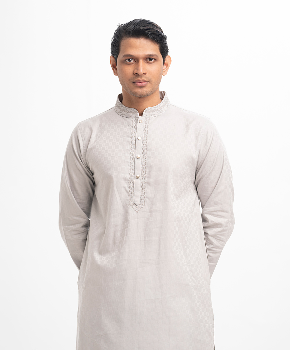 Men’s semi fitted panjabi in cotton jacquard fabric. Mandarin collar with metal buttons on the placket & full sleeves. Inseam pockets & embroidery at front.