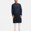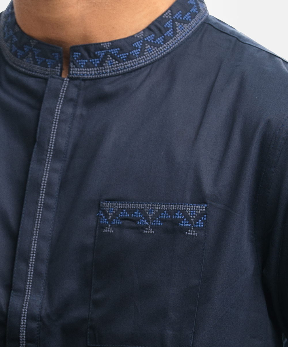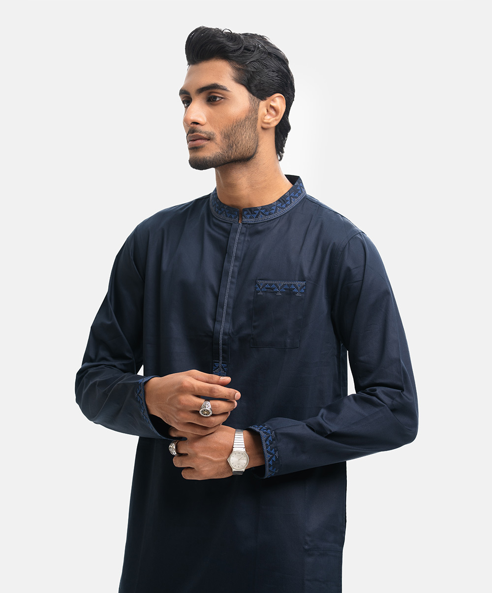 Men’s semi-fitted panjabi in cotton fabric. Embroidery at the mandarin collar, placket & chest pocket. Inseam pockets.